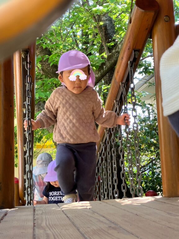 グラグラ階段を登ってすべる、大きな滑り台🛝や、皆んなが大好きお砂場、ブランコ❤️どれもキレイで遊びやすく、子どもたちも先生もハッスルです❗️