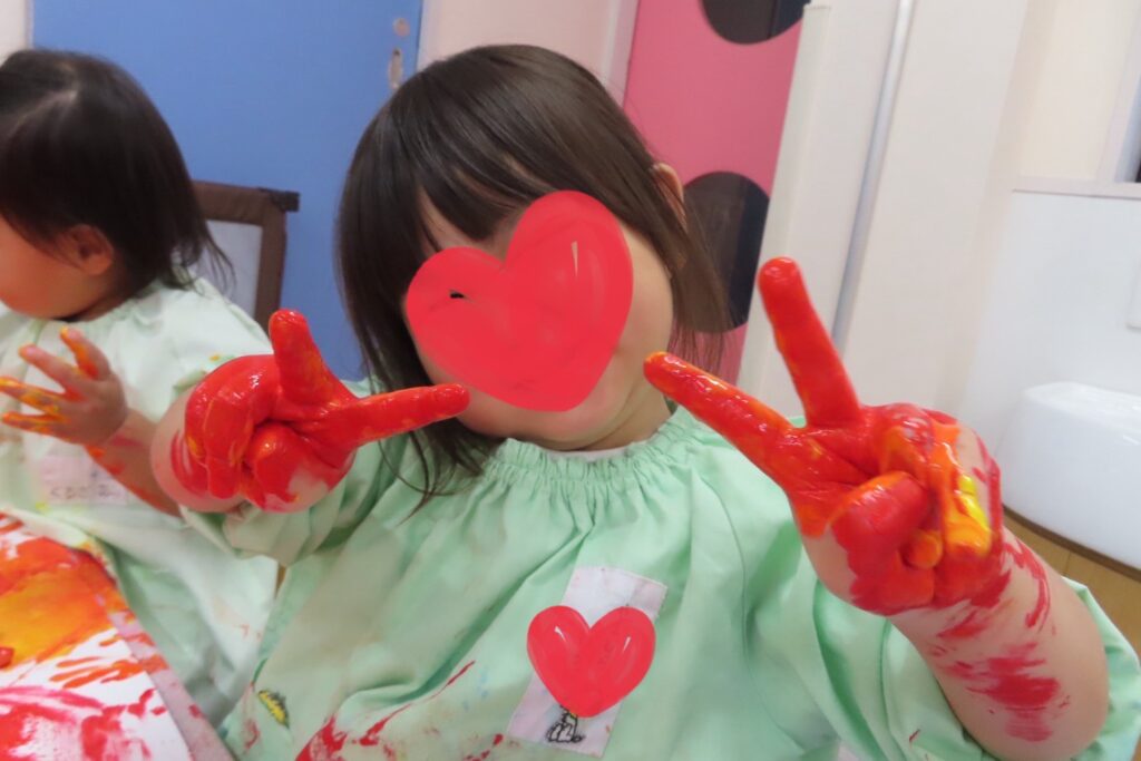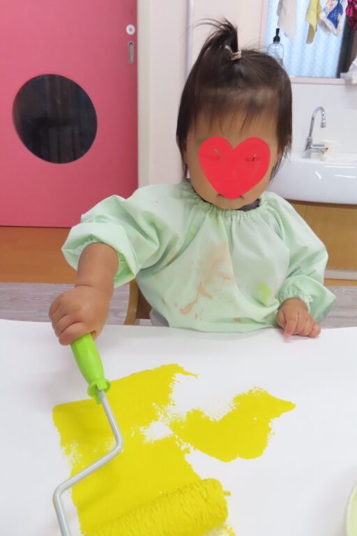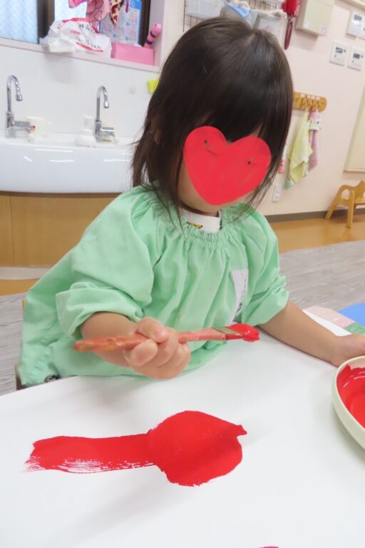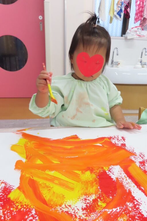 雨の日に大きな画用紙にぬたくり遊びをしました🎨さくら組さんは赤色❤️と黄色💛、つぼみ組さんは青色💙と白色🤍を筆やローラーを使ってぬりぬり🖌️楽しくなってきたみんなは段々とダイナミックになり両手に絵の具を付けてぺたぺたぺた👐✨絵の具まみれになりながらも、ぬたくり遊びを楽しみましたよ☺️