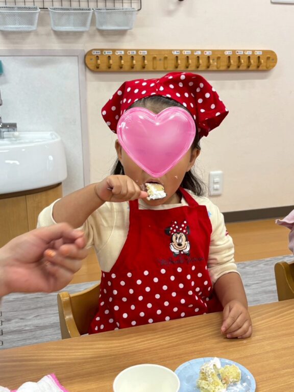 15時のおやつでは食育を兼ねてクリスマスケーキの飾り付けを自分たちでしました(クリスマスケーキ)生クリームをしぼりいちごをそ〜っと乗せるとかわいいいちごケーキの出来上がり🍓りんごジュースと一緒に『おいしいね〜♪』とニコニコ笑顔で食べていましたよ⭐️⭐️⭐️