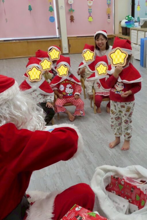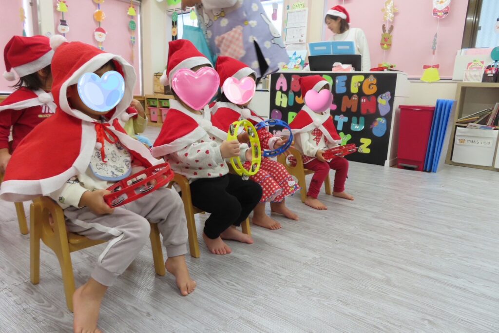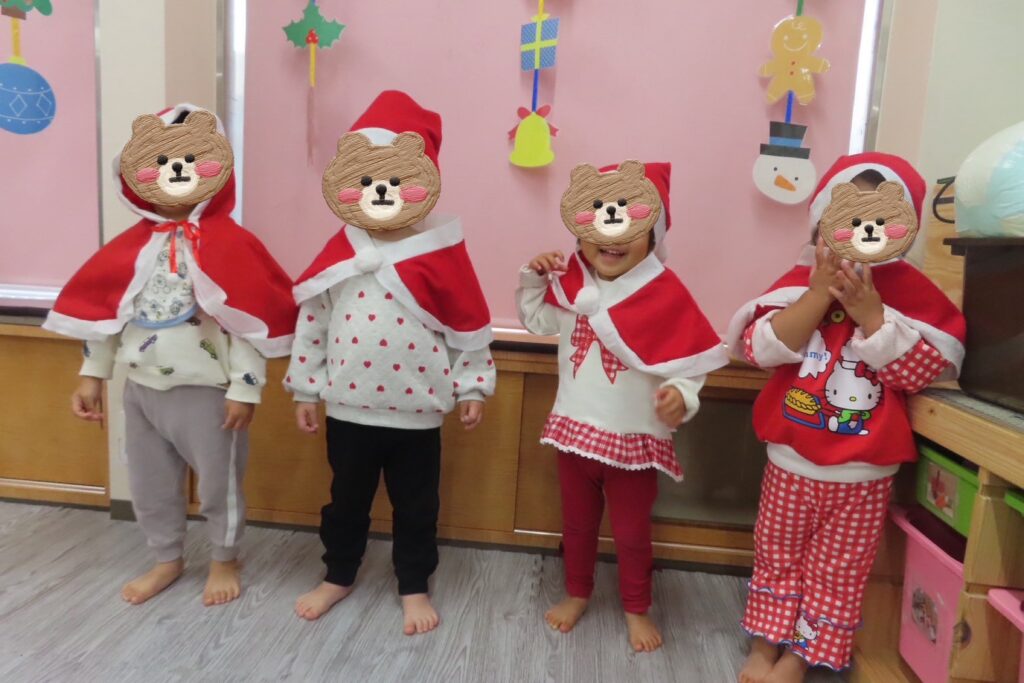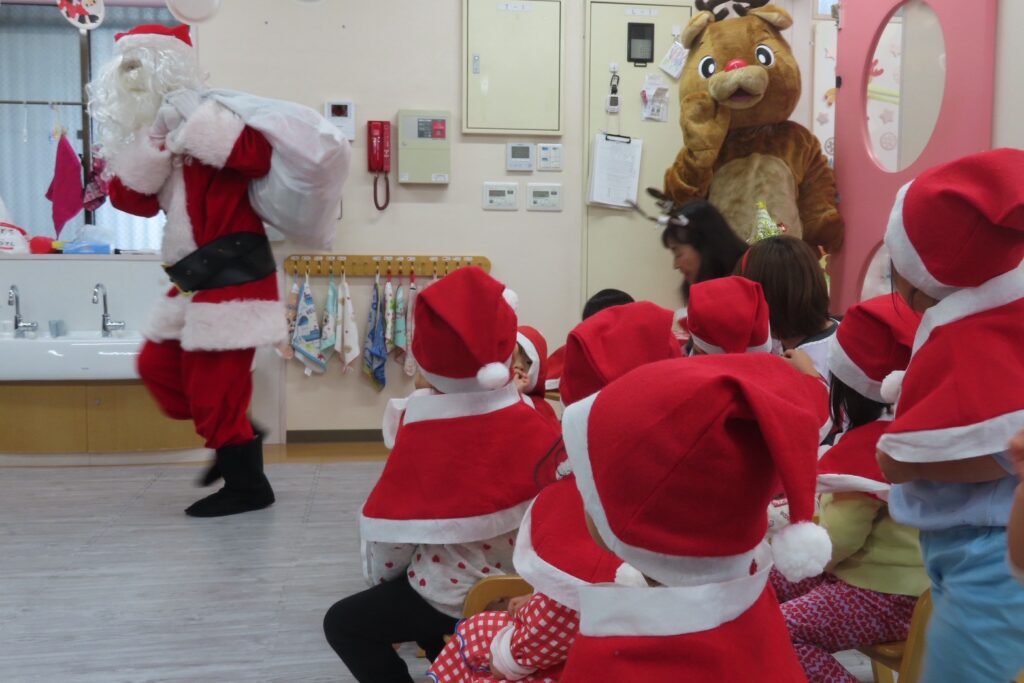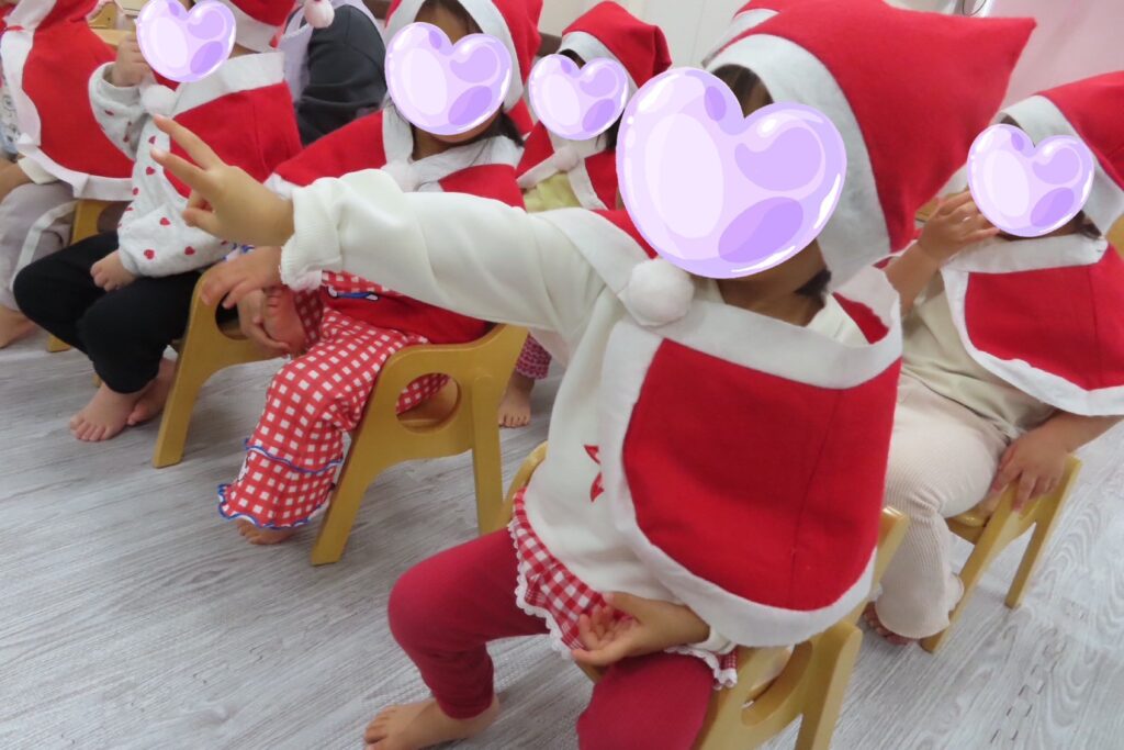 少し早いクリスマス会を行いました🎄朝の牛乳が終わったら、みんなは帽子やケープを付けてかわいいサンタクロースに変身🤶✨スケッチブックシアターでクリスマスってどんな日かなと聞いていくと「トナカイさんのソリに乗ってお空を飛んできてくれるよ🌌」と教えてもらい、空を見つめる素直な子どもたち🛷「サンタさんに何の質問しよう🥰」と考え、誕生日会の様に「どんな色がすき🩵?」「好きな食べ物なんですか🍗?」から始まり「何歳ですか🎅?」と聞くつもりがサンタさんを前にすると『✌️2歳✨』と聞くよりも自分の歳を教えてあげていましたよ😜