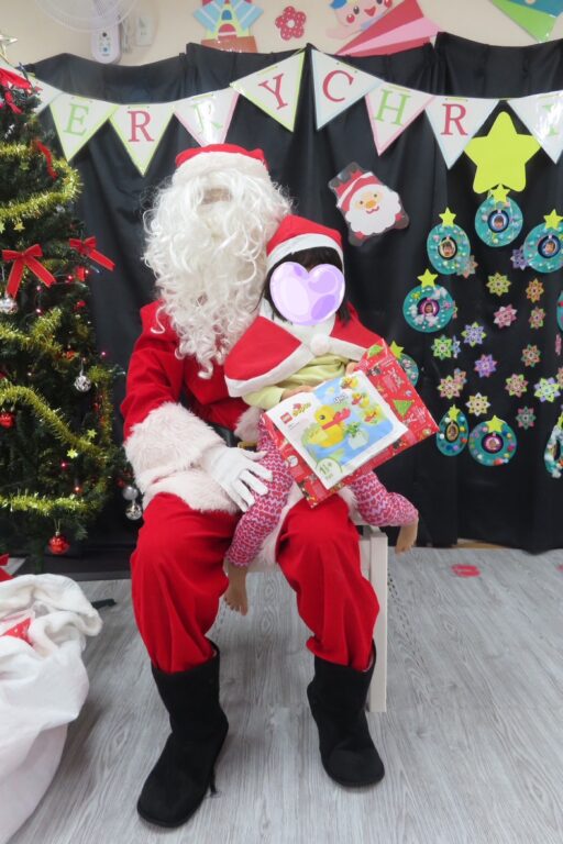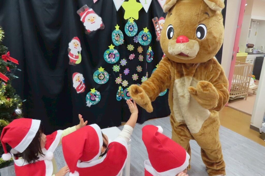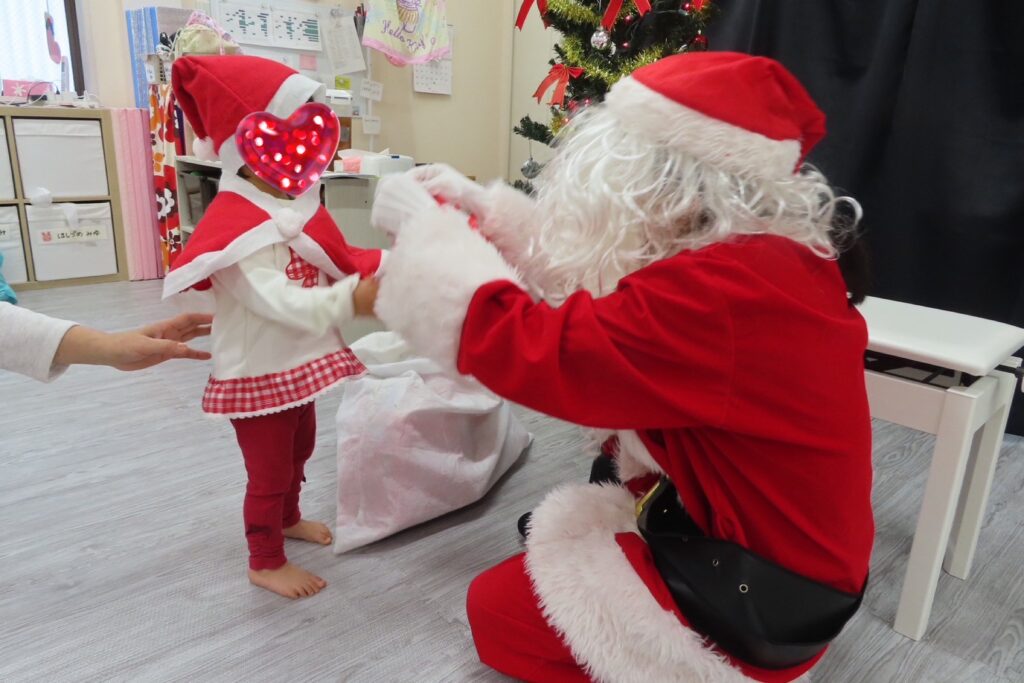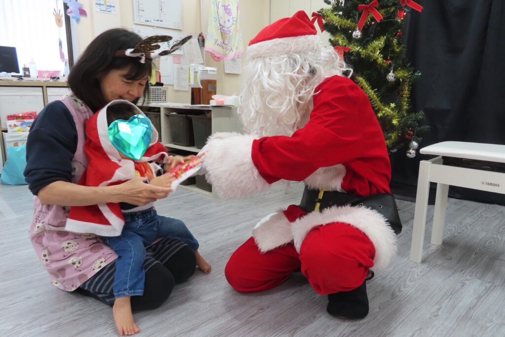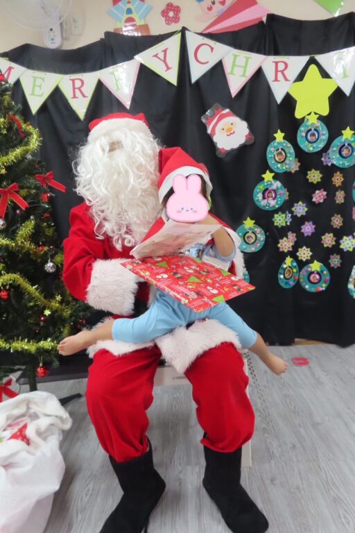 サンタさんと一緒に来てくれたトナカイのルドルフ君🫎には大きくてびっくりして泣き出す子もいましたが、みんなの注目は白い大きな袋⭐️1人ずつプレゼントを貰って、抱っこで記念撮影📸去年は泣いてしまった子も1つ大きくなり、緊張しながらもニッコリ笑えるようになっていて成長を感じました😄🩷