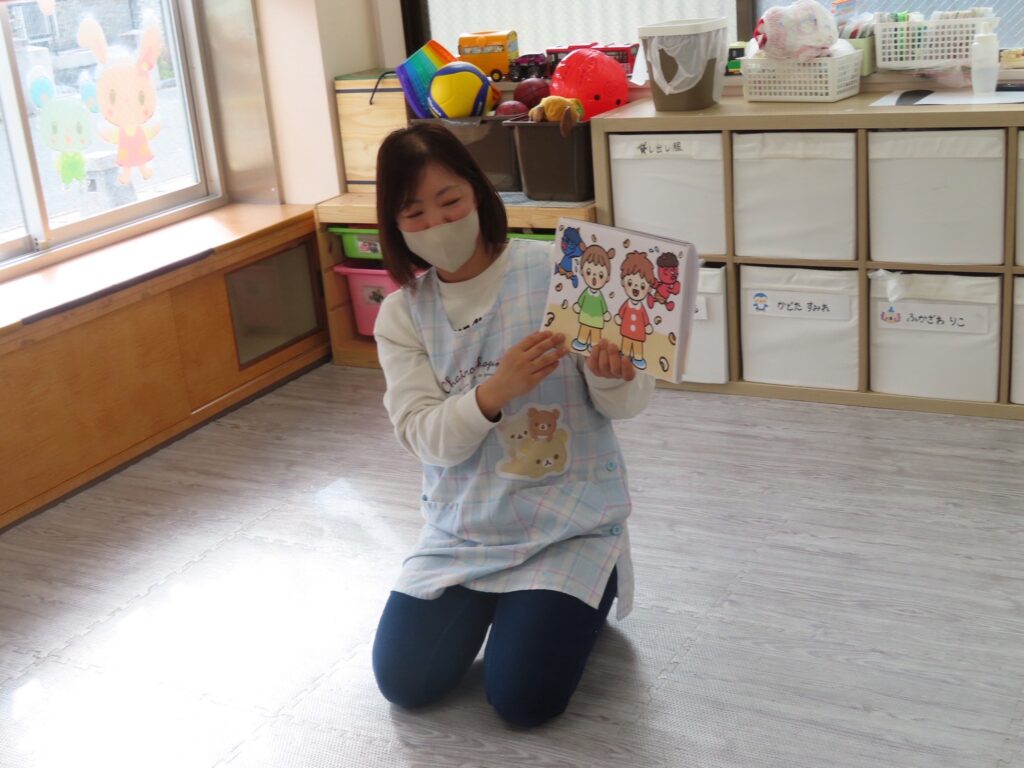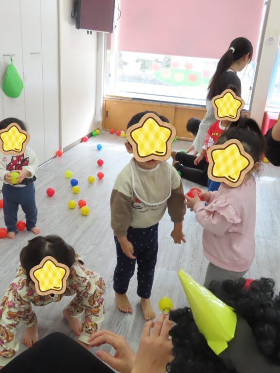 スケッチブックシアターで『皆んなの中の「おこりんぼう鬼👹」や「イヤイヤ鬼👹」をやっつけよう✨』と聞いてやる気まんまんの子どもたち😤💪先生が角を付けて出てくると『〇〇先生鬼だーっ😳』『おにはーそとっ🖐️』と大きな声でカラーボールを投げつけて、お友だちを守ろうとするかっこいい子もいましたよ😁それを見て怖がっていた子も勇気を持ってボールを投げつける事ができました🔴🟡🟢🔵