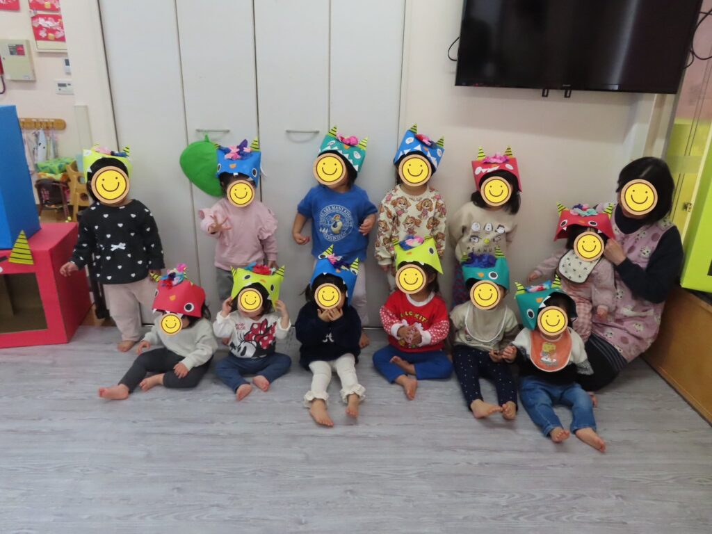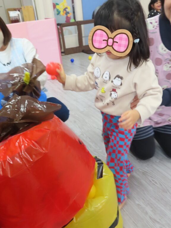 朝から『鬼来る?🥺』と不安そうに登園する子どももいる中、玄関から見える所に、ふわふわの袋鬼が居て、『ほら、怖くないよ😊』と声をかけるとニッコリ笑顔で入室できました😄