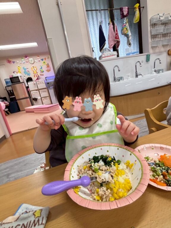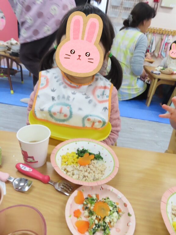 給食にはにんじんうさぎや星が乗った三色丼と花麸のお吸い物 😋おやつには桃のゼリーで1日楽しく過ごせて良かったです😋😊🥰