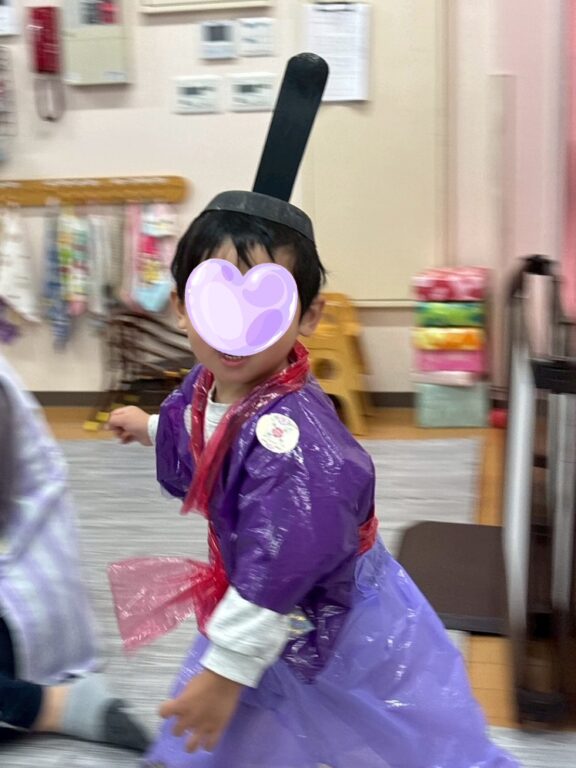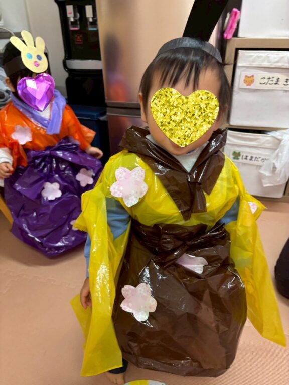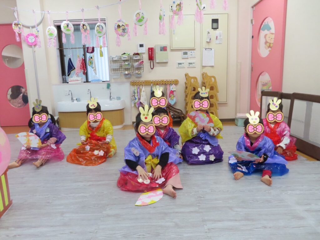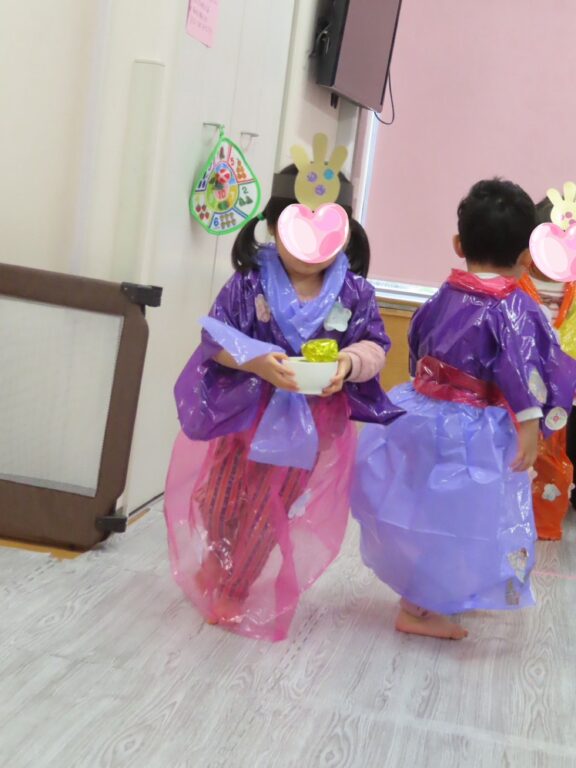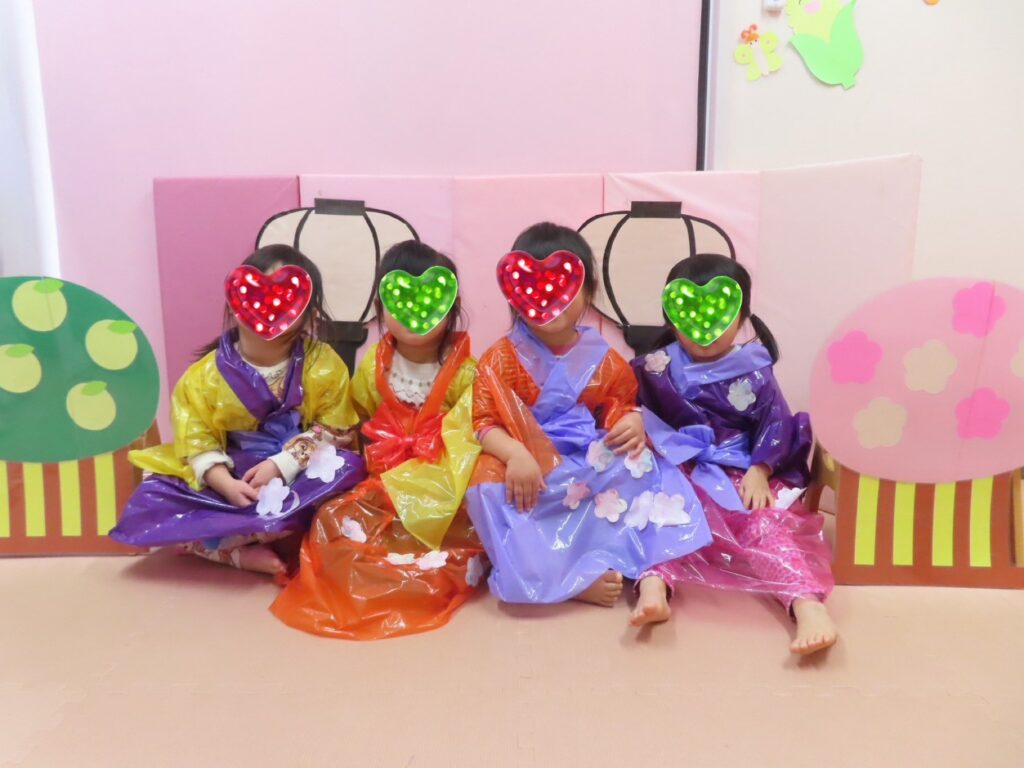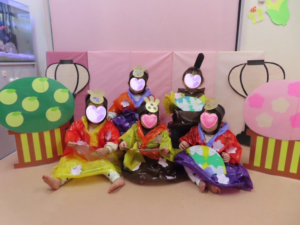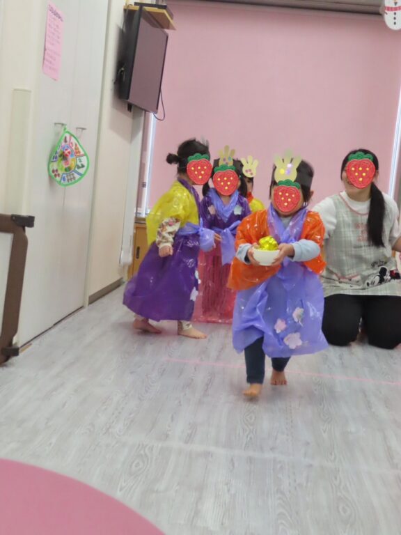 皆でスケッチブックシアターを見て「皆もおひなさまに変身してみようー🎎」と衣装や冠を着けて「かわいい💕」と自画自賛 🥰自分たちで染め紙した扇子も持って『はいポーズ📸』ニッコリ笑う子もいれば照れてはにかみ笑いの子もいました☺️それぞれステキな写真が撮れましたよ👌