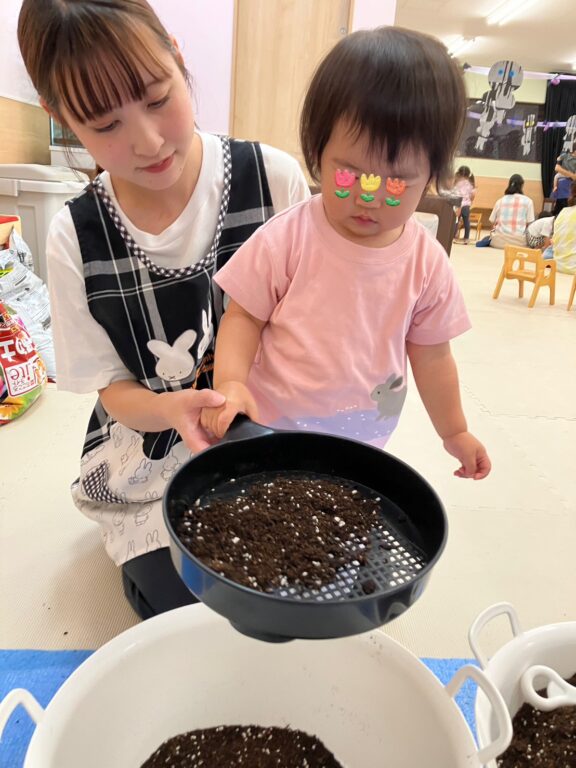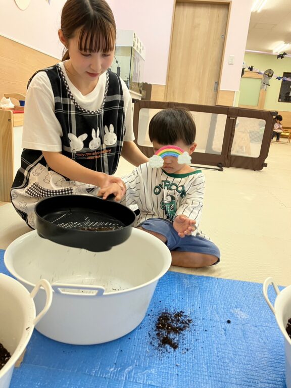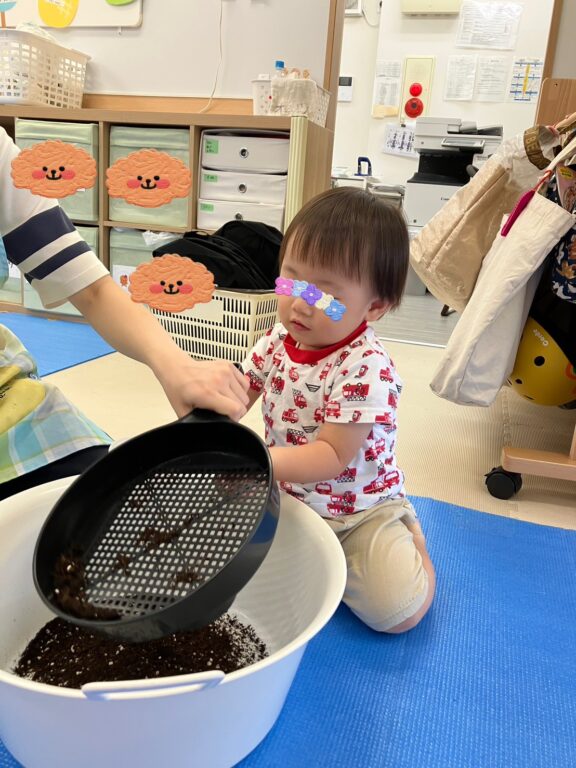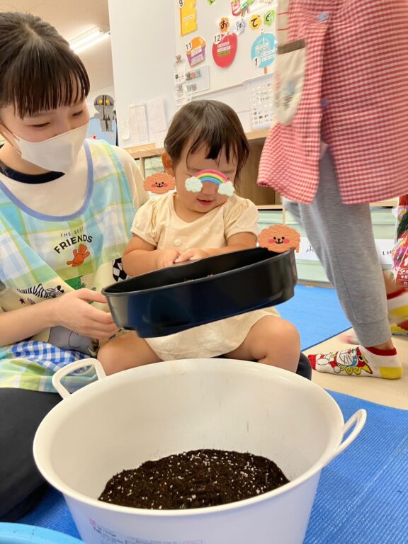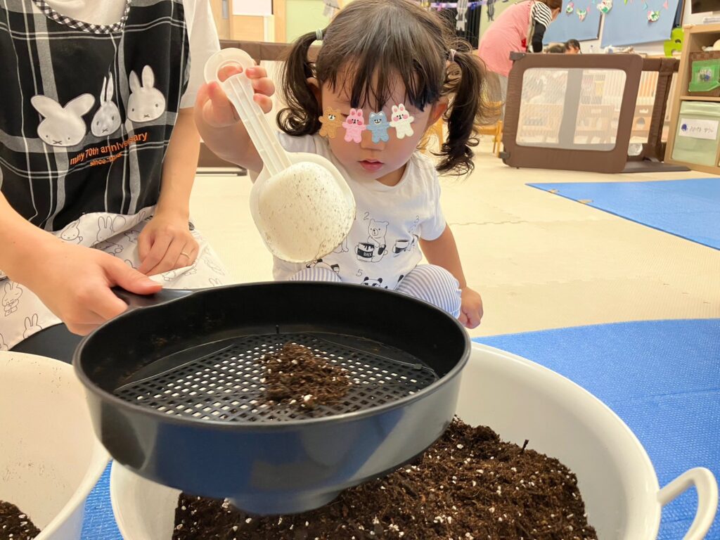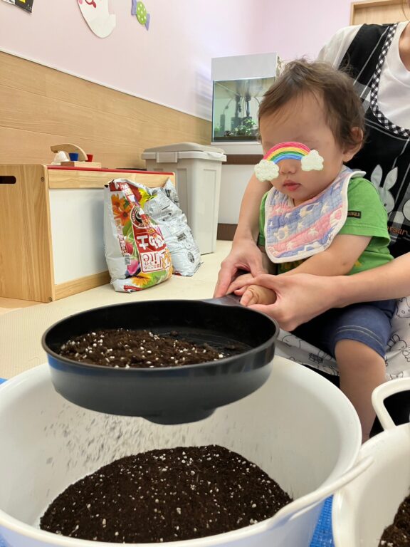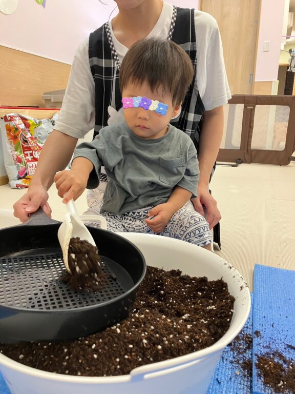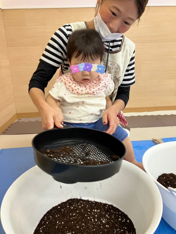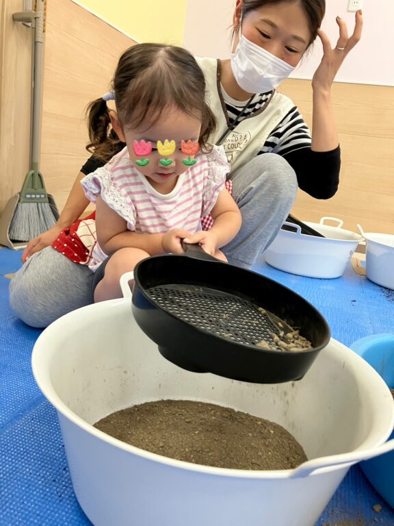 キレイな土にする為に、ザルで土をこしたり、空気を入れる為に畑の土を混ぜたり😊
