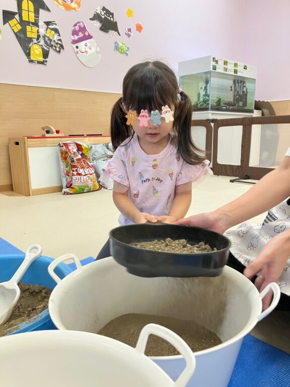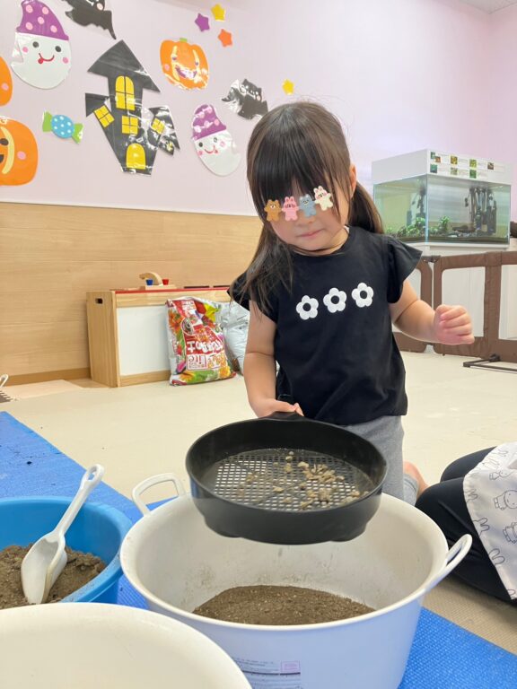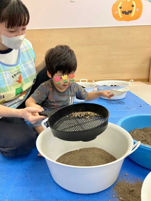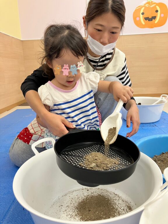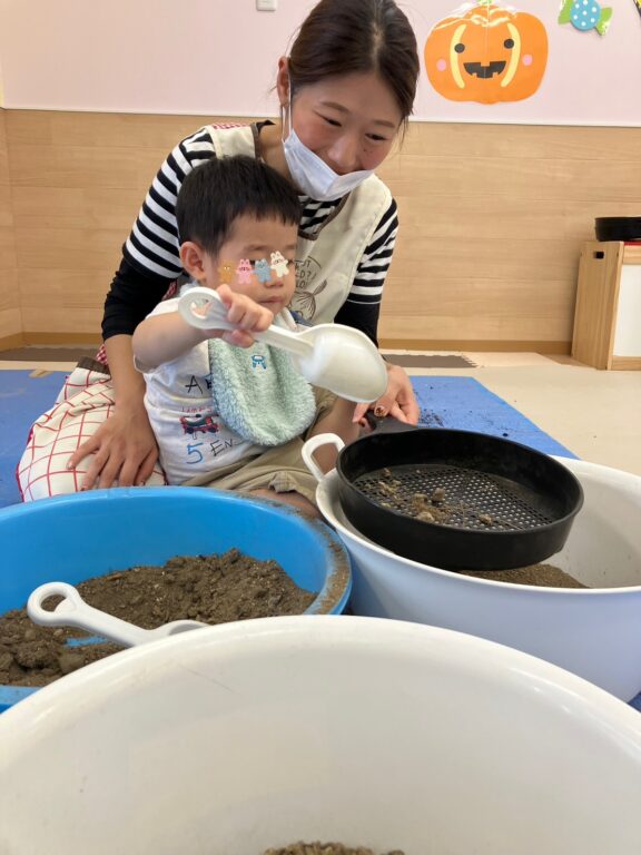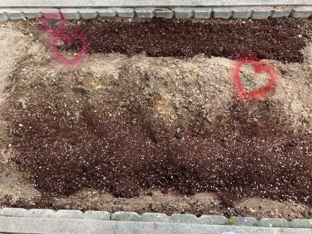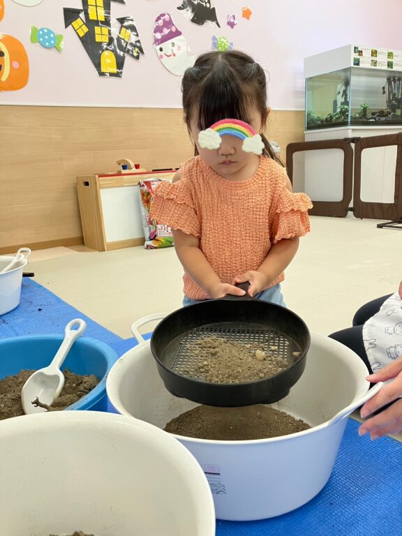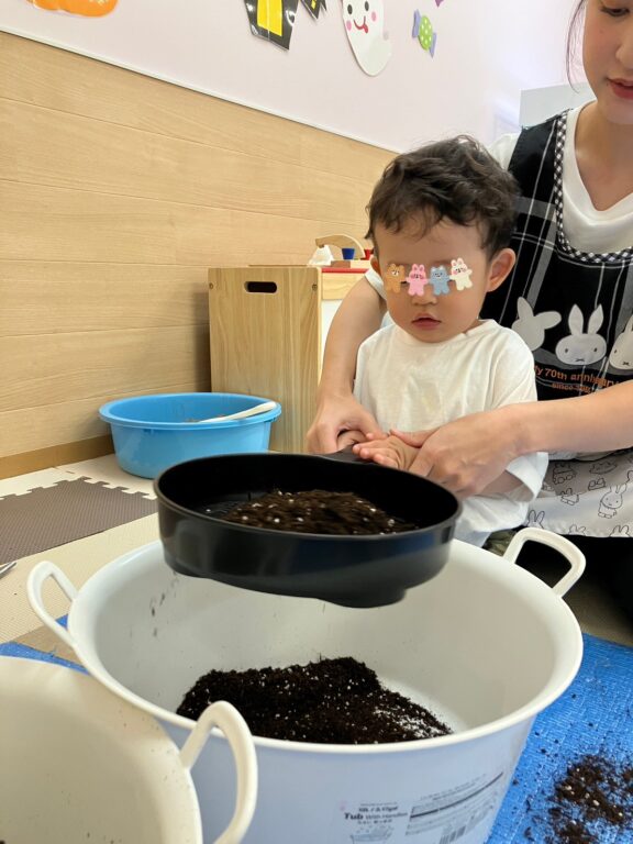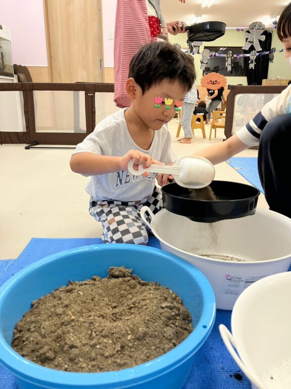キレイな土にする為に、ザルで土をこしたり、空気を入れる為に畑の土を混ぜたり😊