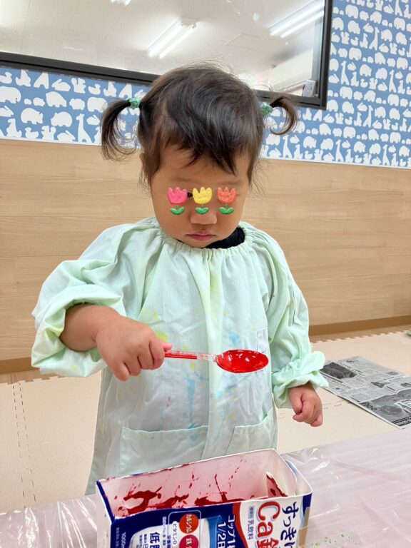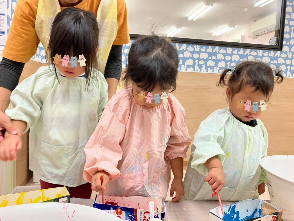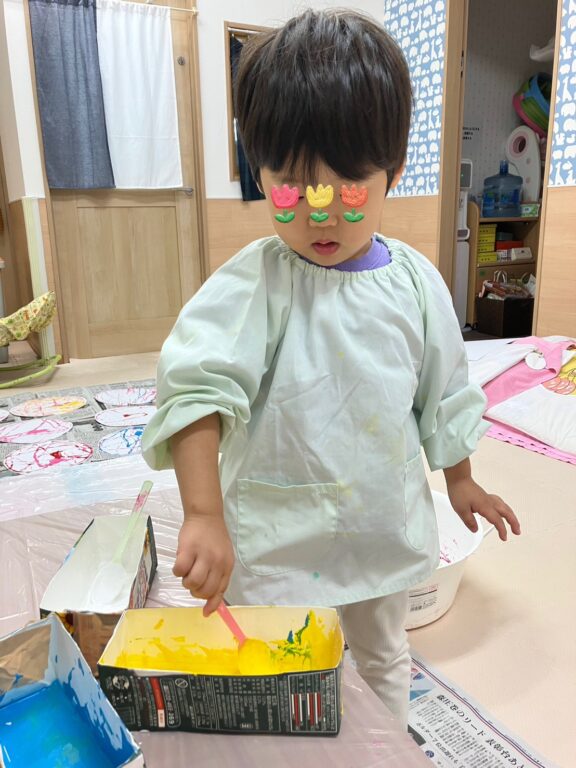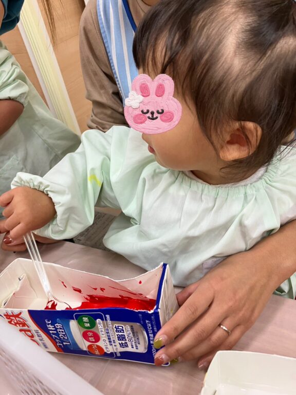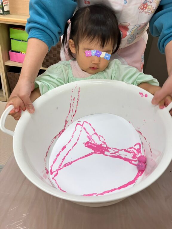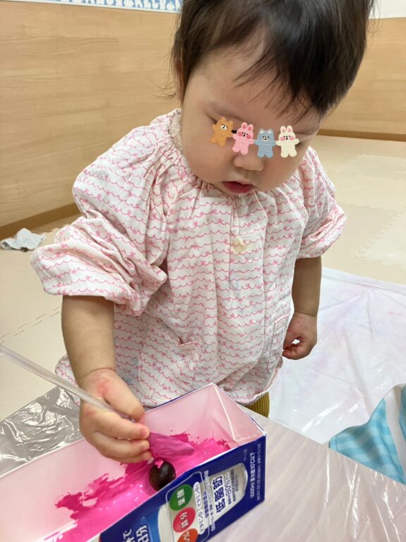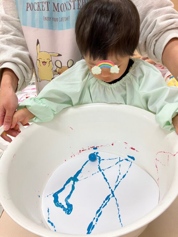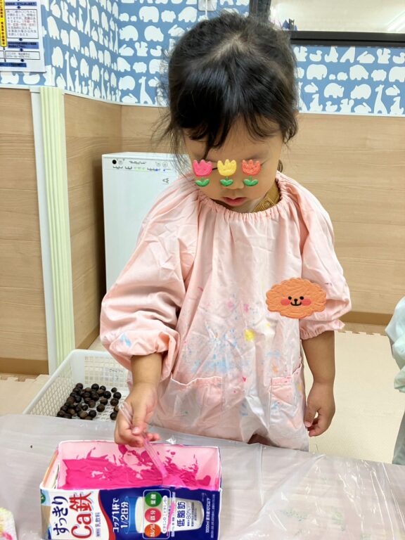「そうだ❣️絵の具を付けたどんぐりさんで、コロコロ絵の具遊びしよう😊楽しんでくれるかな❓」