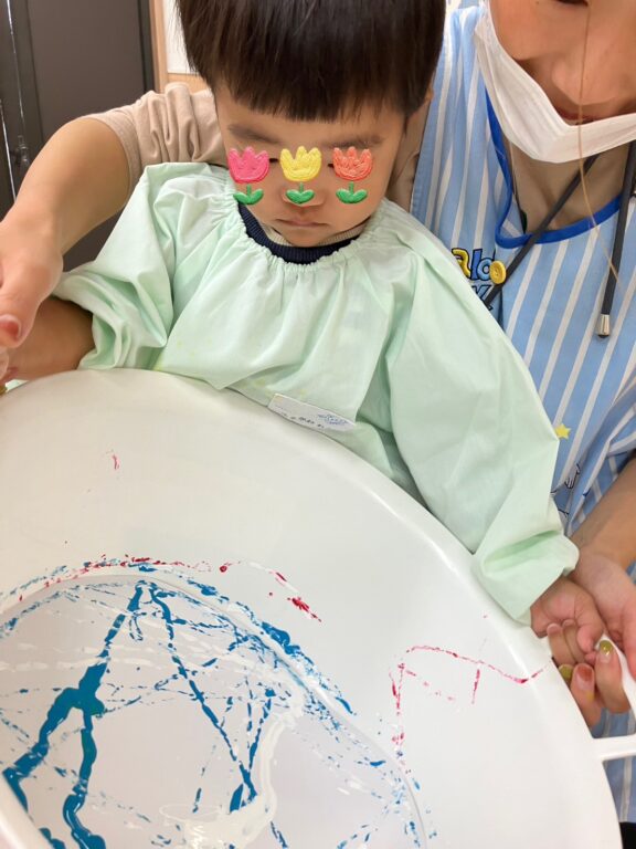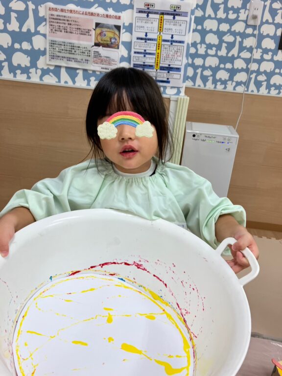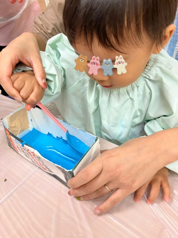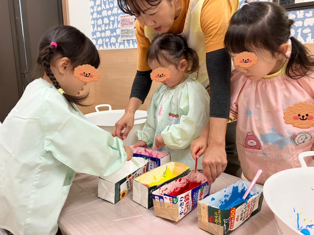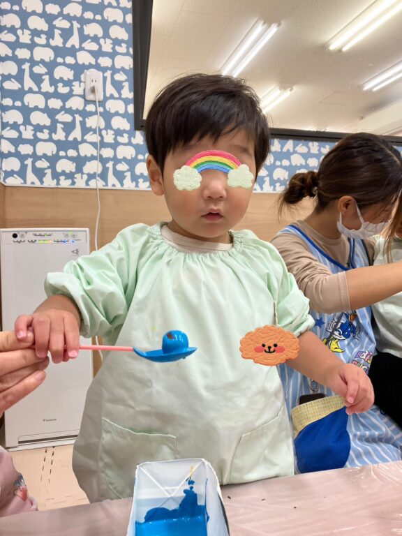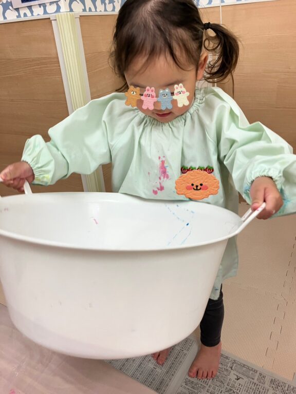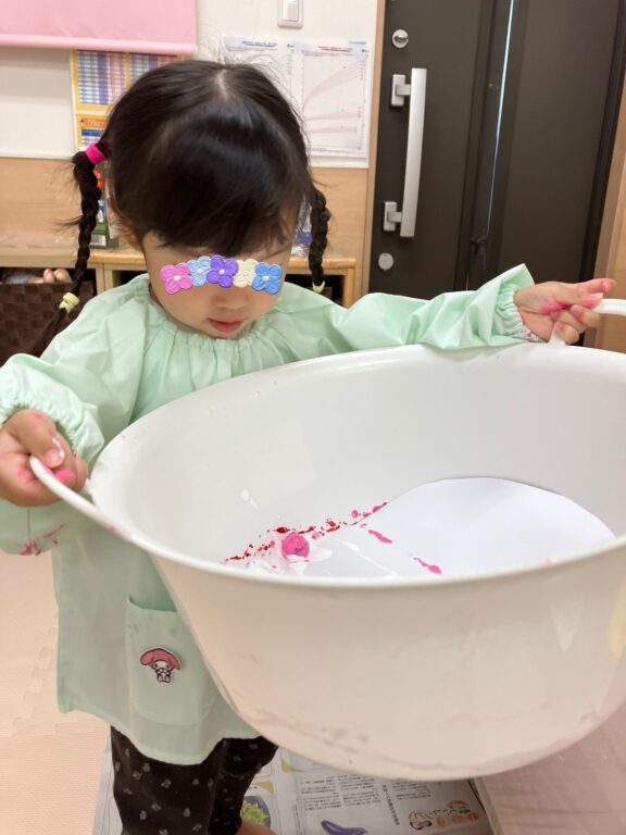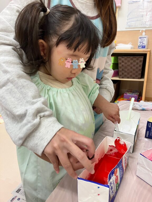 「そうだ❣️絵の具を付けたどんぐりさんで、コロコロ絵の具遊びしよう😊楽しんでくれるかな❓」