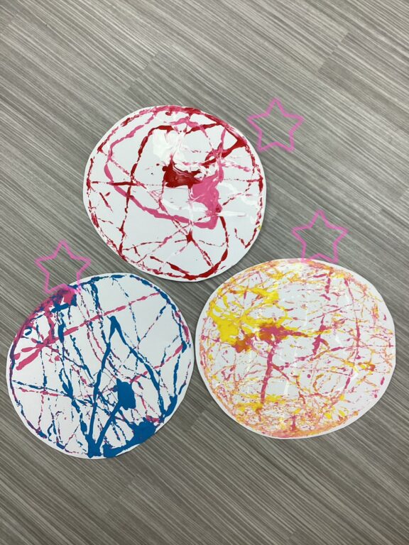 スプーンでまずは絵の具のお風呂にどんぐりさんをくぐらせ😍画用紙のひいたタライに、おしゃれになったどんぐりさんをコロンと入れて、タライを横に動かすと🤩