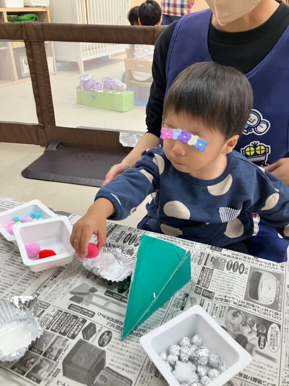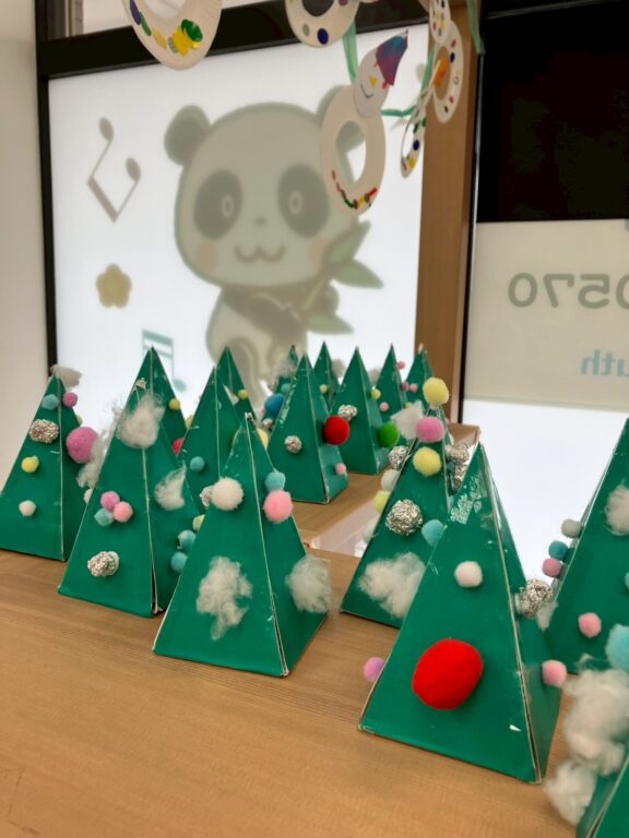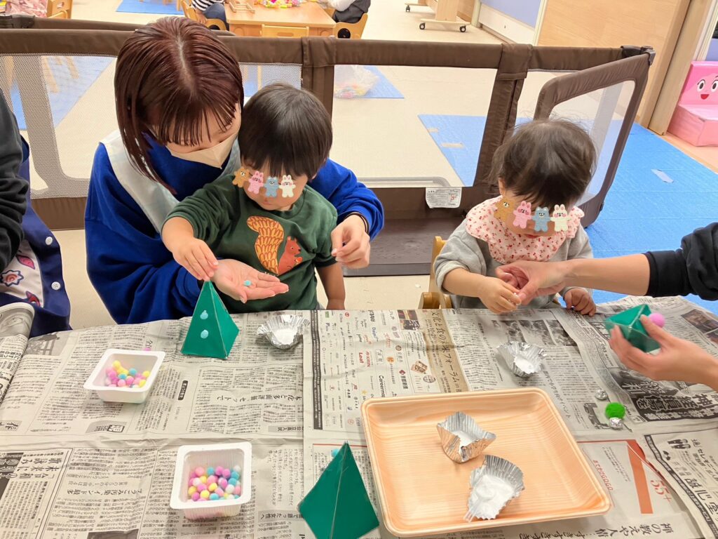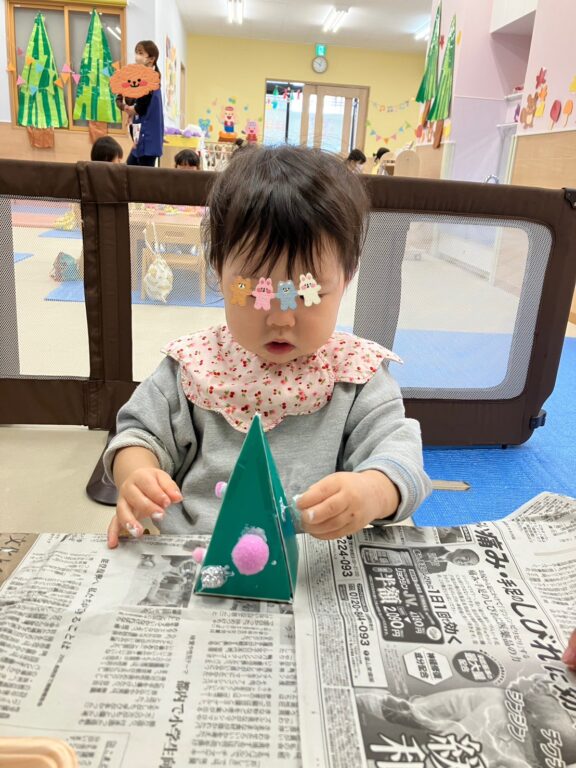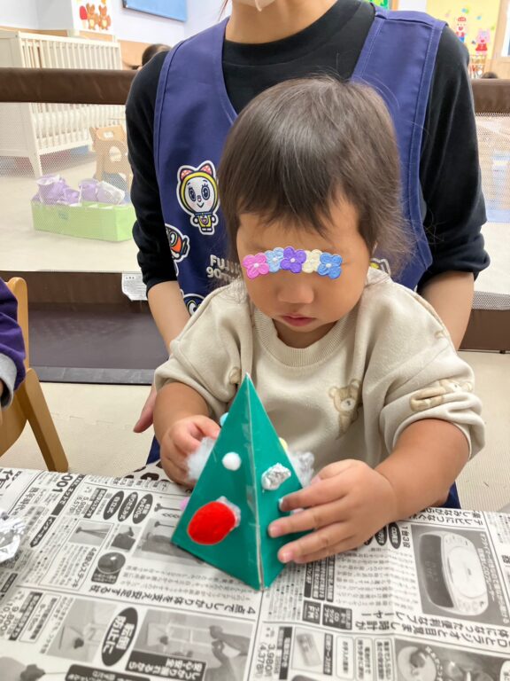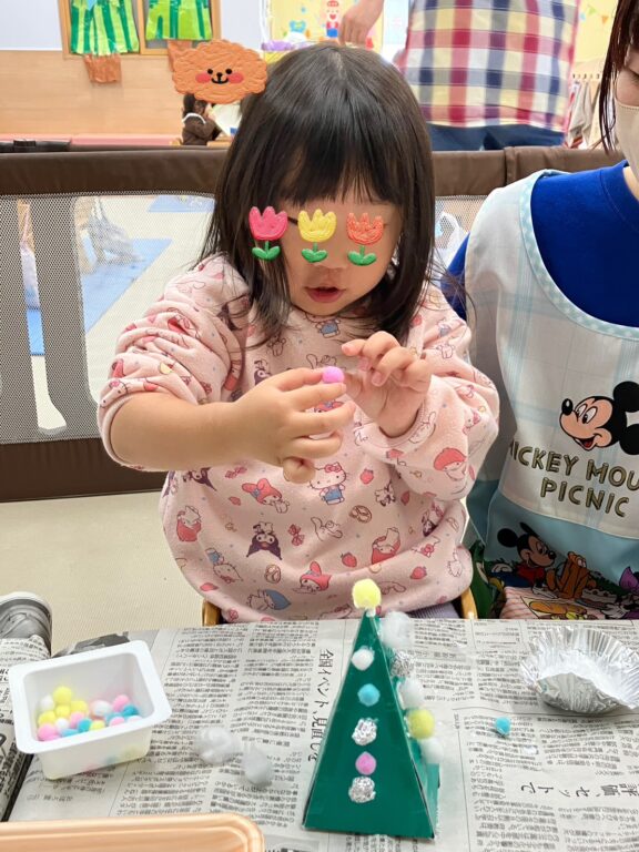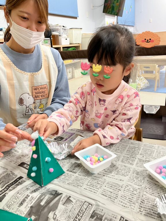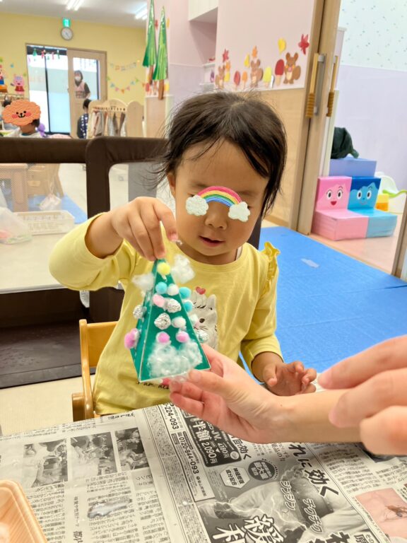 立体のクリスマスツリーに、子ども達の思いを込めて可愛いらしいぽんぽんやキレイな綿をちぎり、ボンドで優しく付けて行きます❤️