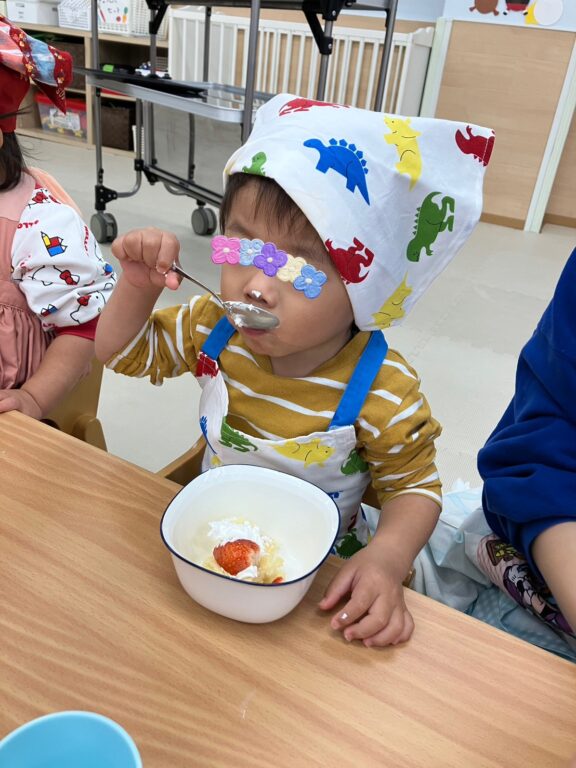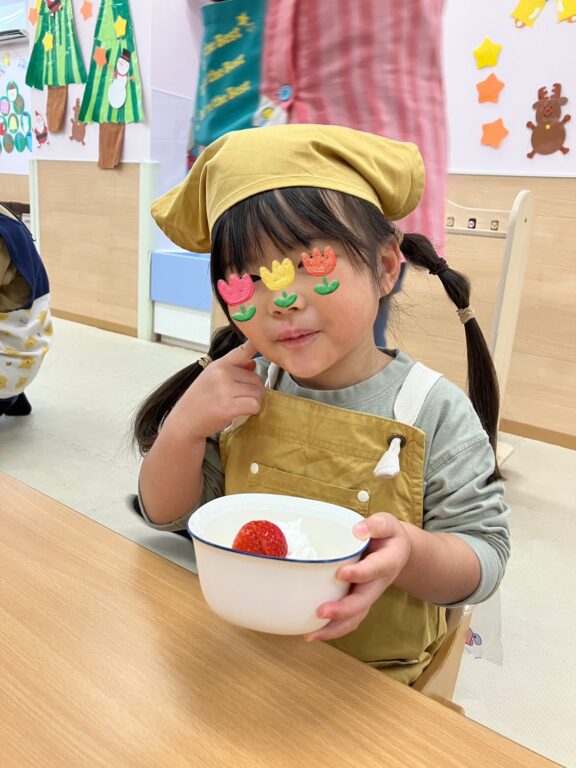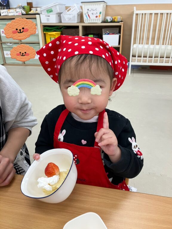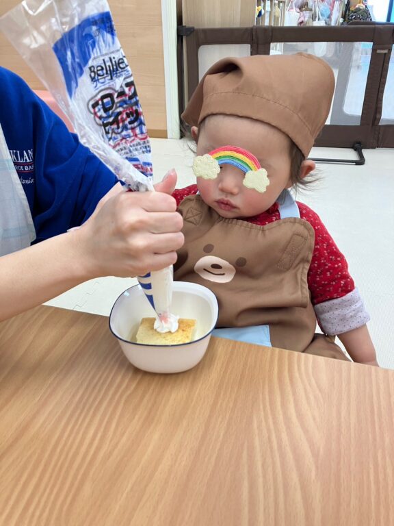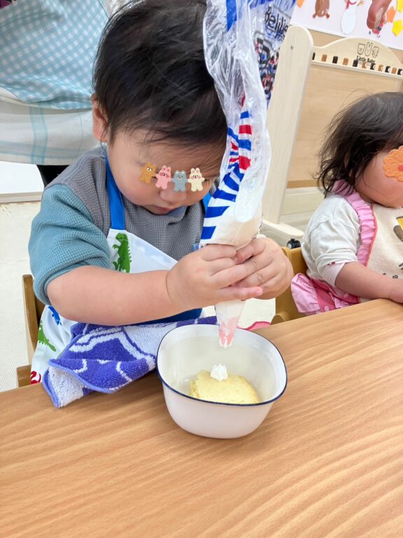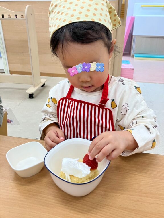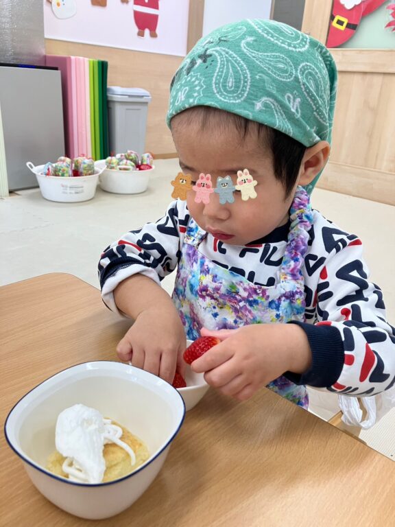 お昼寝を経て今日のおやつは「クッキング クリスマスケーキを作ろう🧁」1人ずつのスポンジケーキに、先生と一緒にクリームをしぼり、最後は🍓イチゴのトッピング🥰