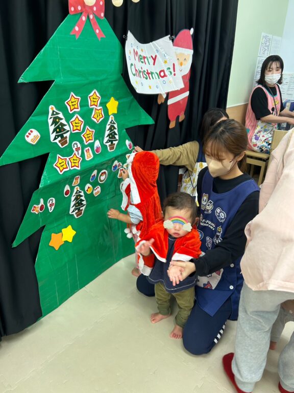「大きなツリーにオーナメントをつけよう🎄、オーナメントを探そうゲーム」では、沢山のオーナメントを手に、一生懸命ペタリ❄️