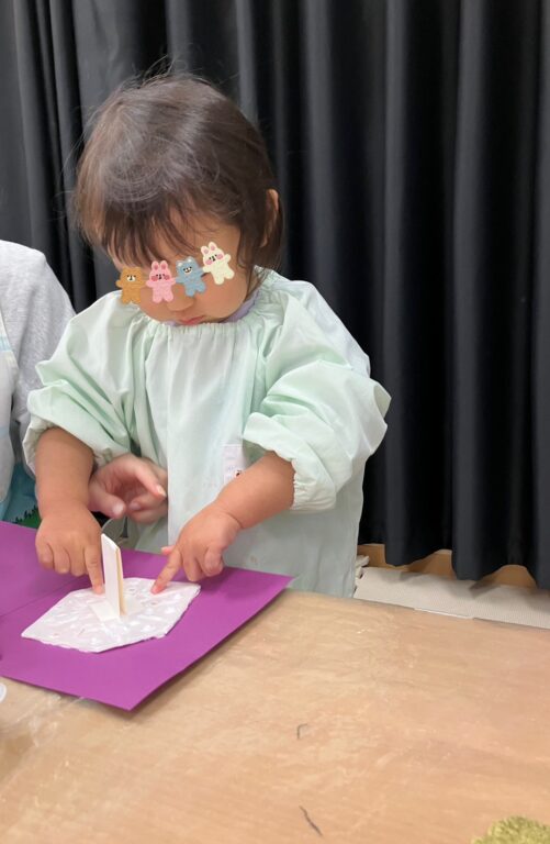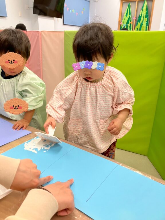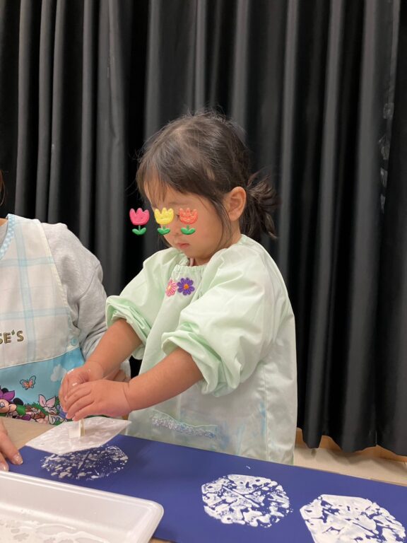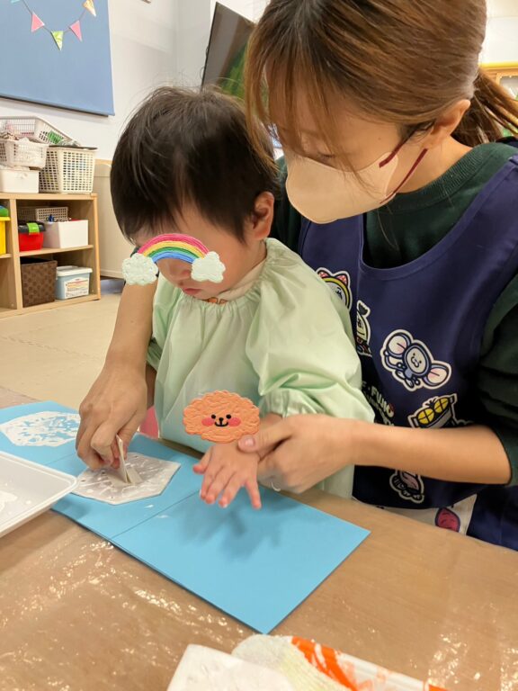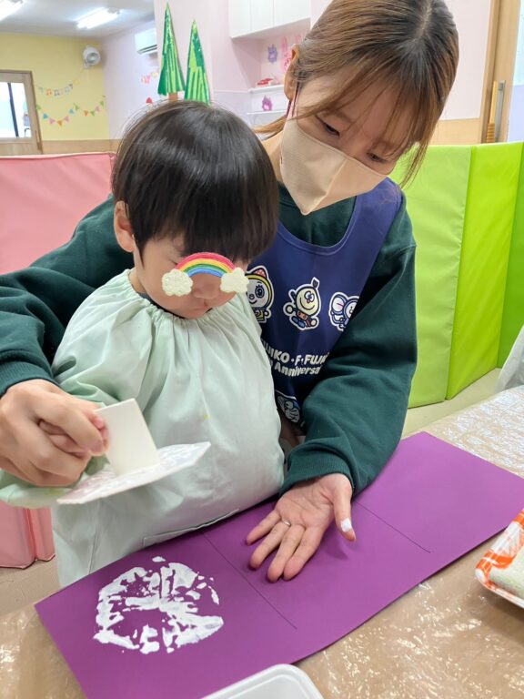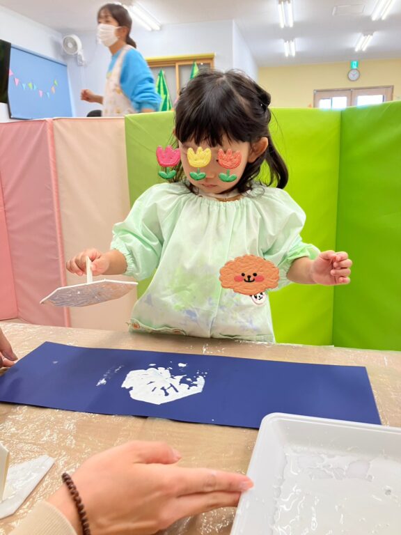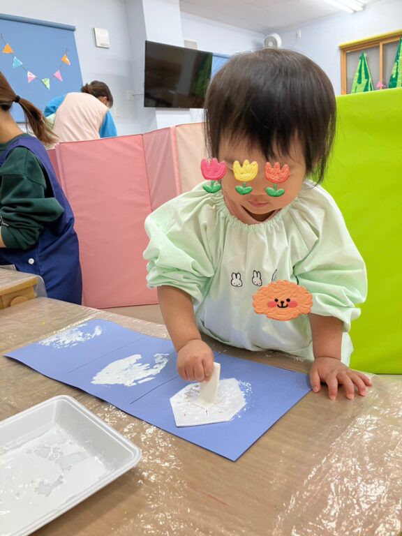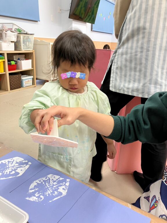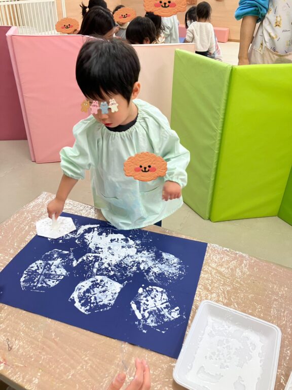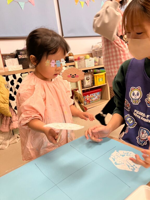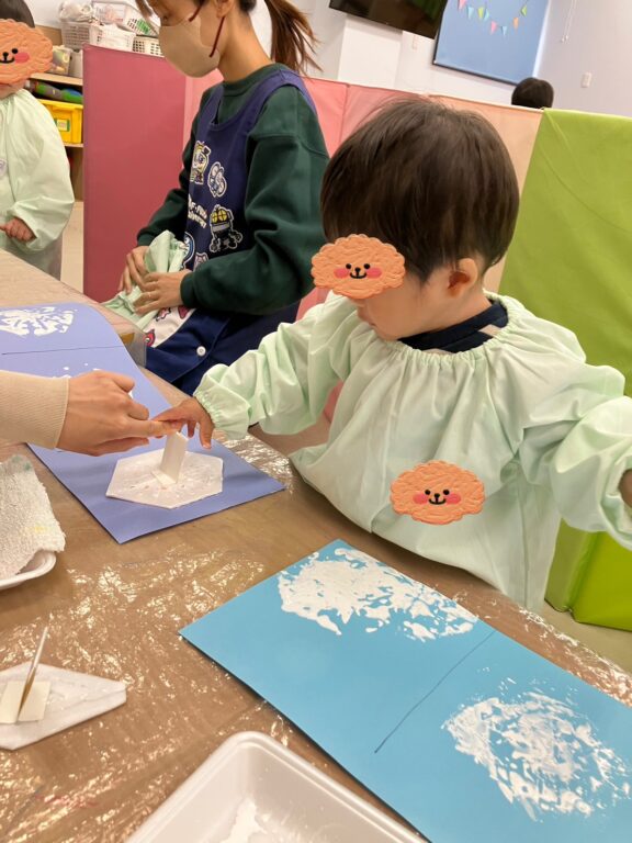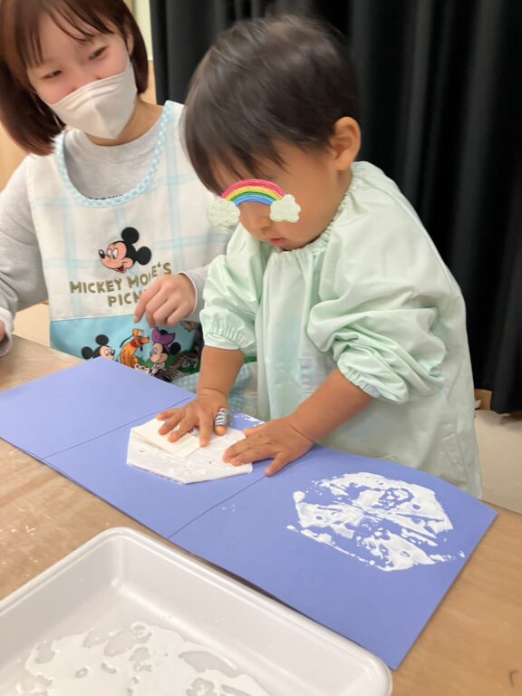 「寒くなったら雪が降るかな❓❄️」「ゆっくりペッタンして、白い綺麗な雪の結晶を作ってみてね🥰」先生と一緒にゆっくり優しくスタンプする子ども達🌟「いっぱいしたい❗️」「つぎはちがういろのがようしにする❣️」