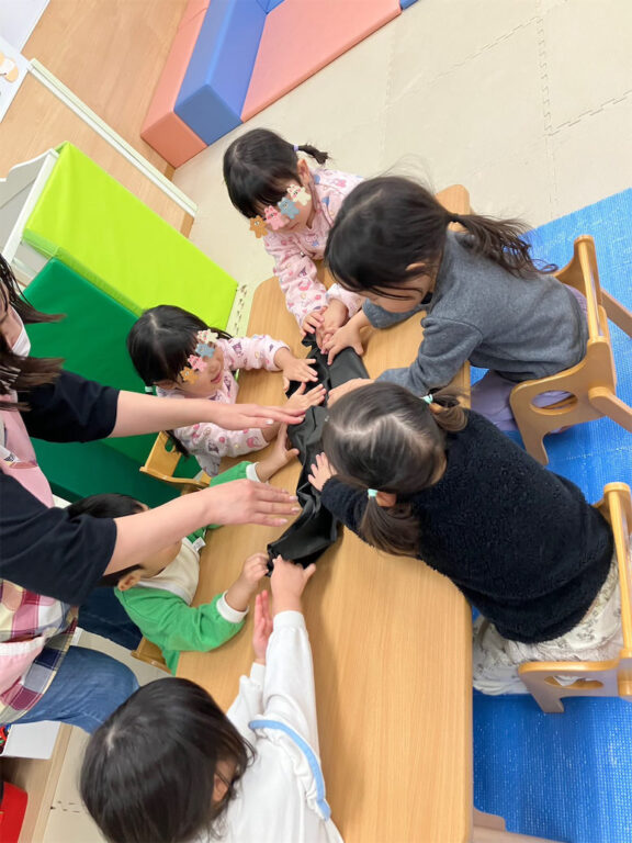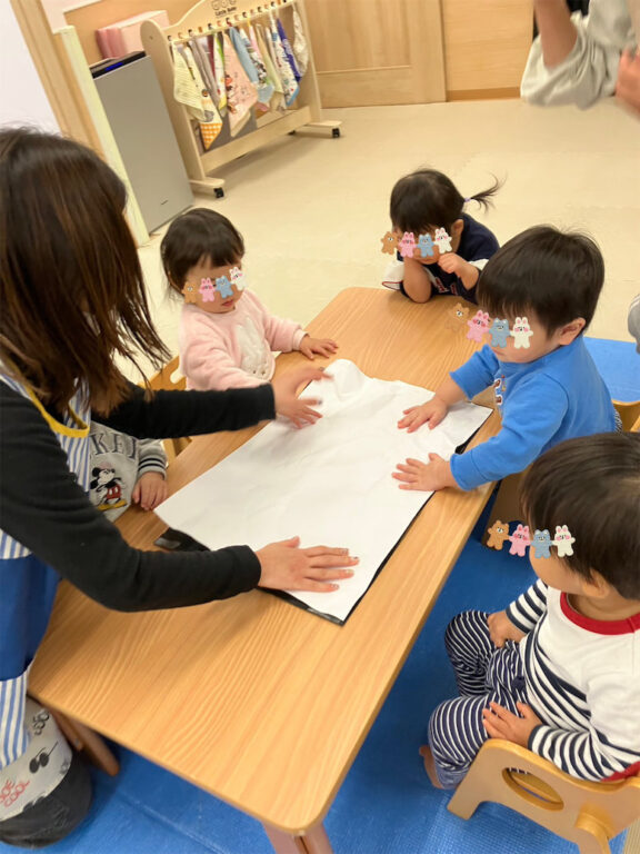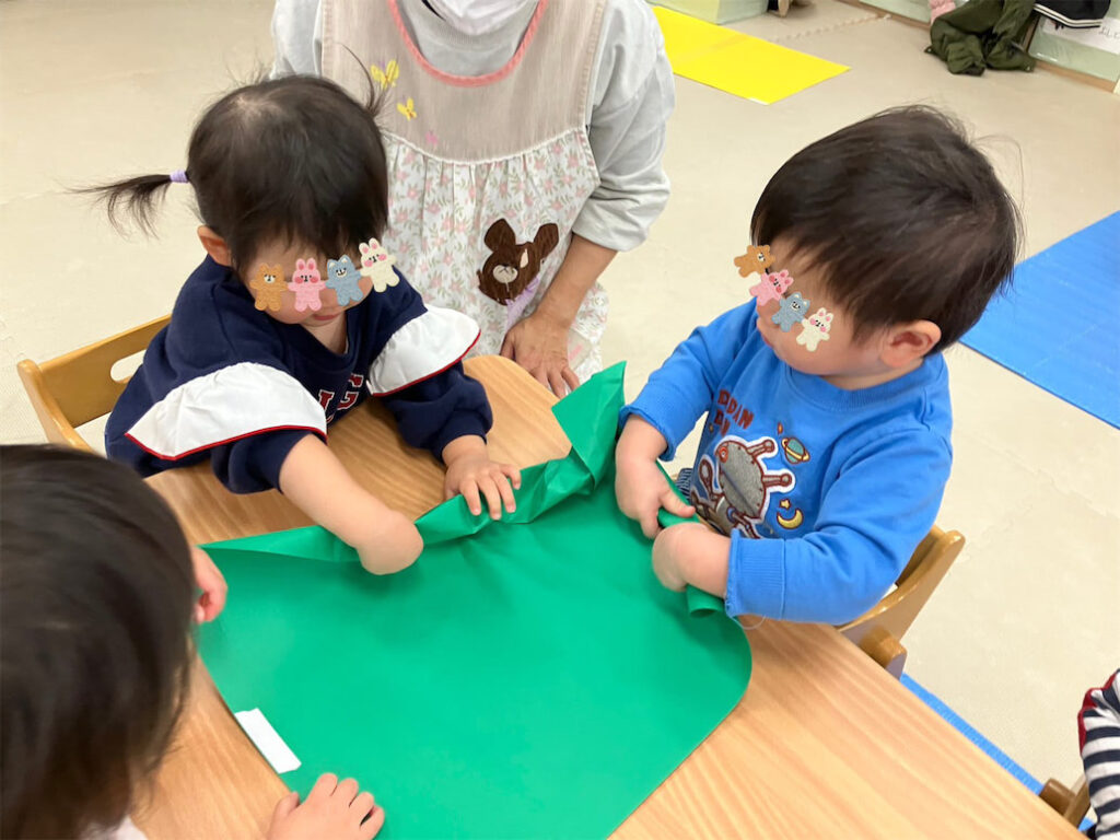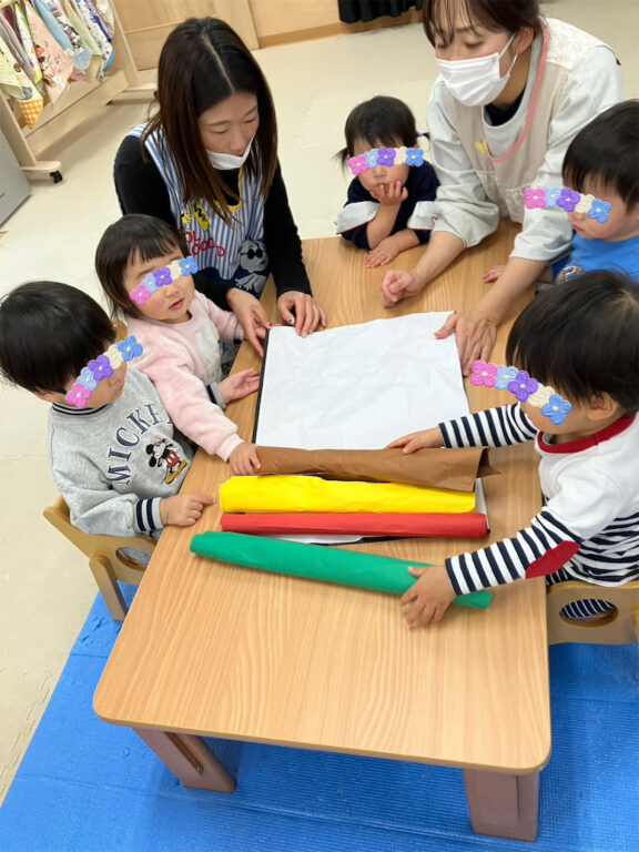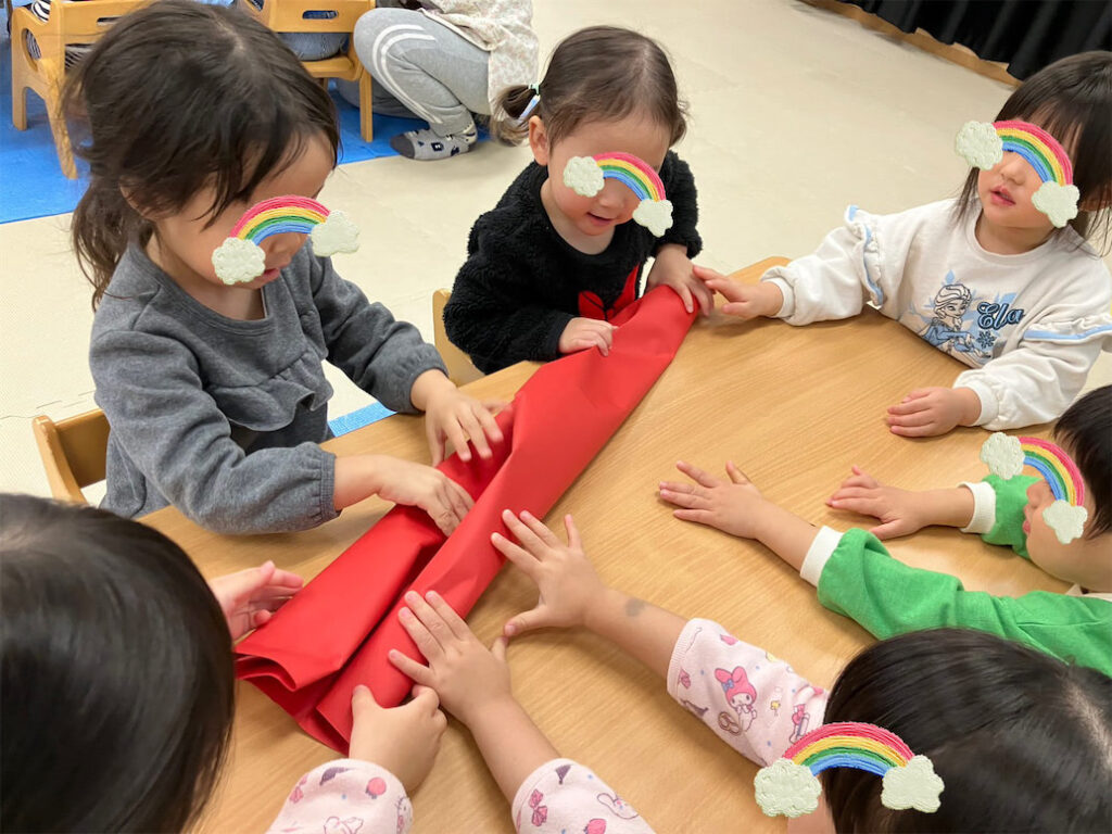 海苔の黒色、玉子焼きの黄色、エビの赤色、きゅうりの緑色、かんぴょうの茶色☺️それぞれの説明を聞きながら、画用紙をくしゃくしゃしたり丸めたり🥰お友だちや先生と協力しあって立派な恵方巻きの完成‼️