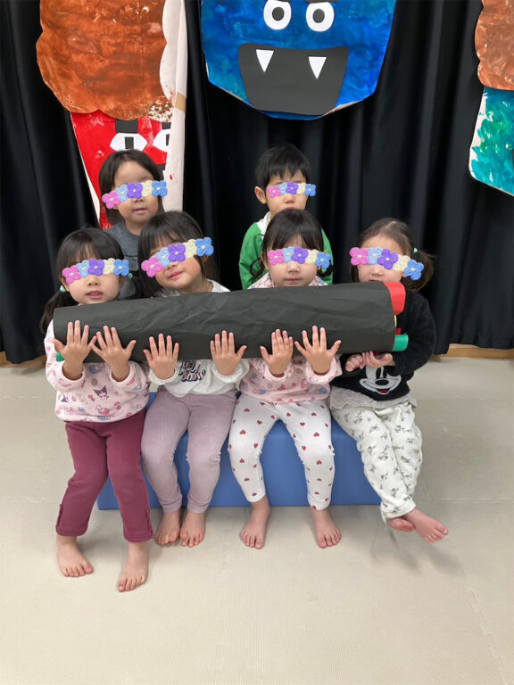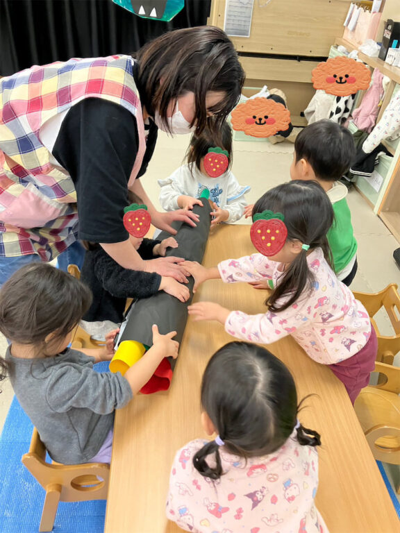 「鬼さんに豆まきをした後、お家で食べるかもしれないね☺️」「巻き寿司を食べて、お腹の中にいるかもしれない鬼さんを、やっつけよー‼️」