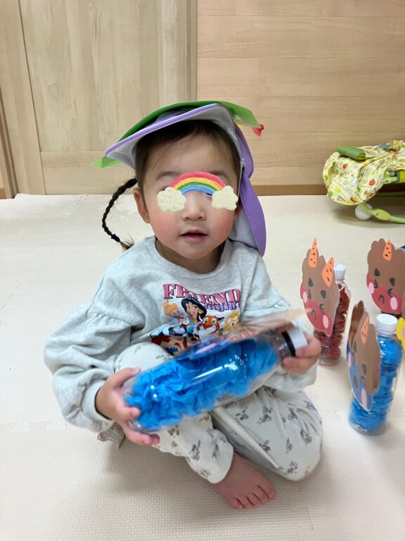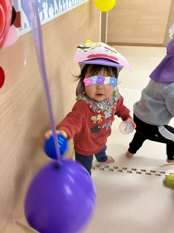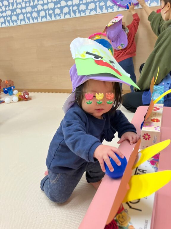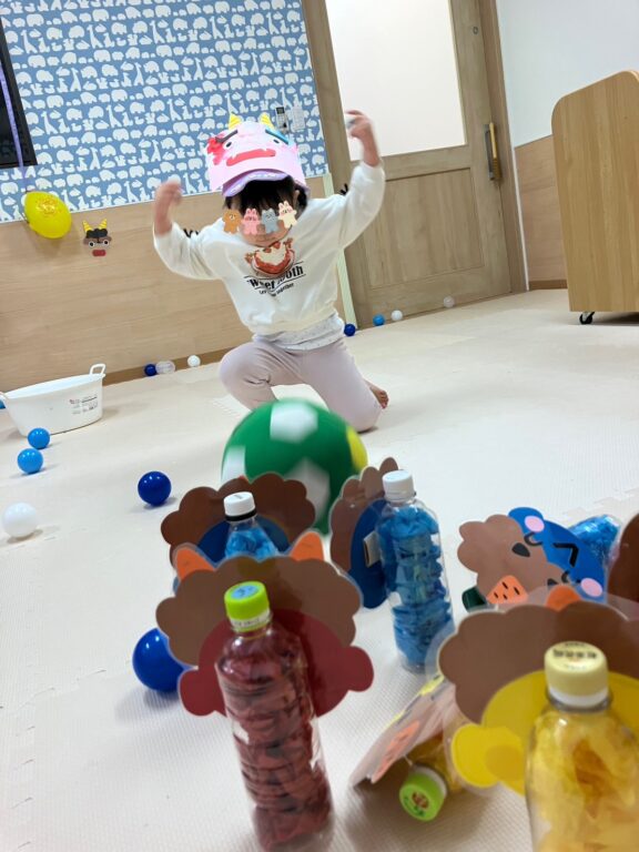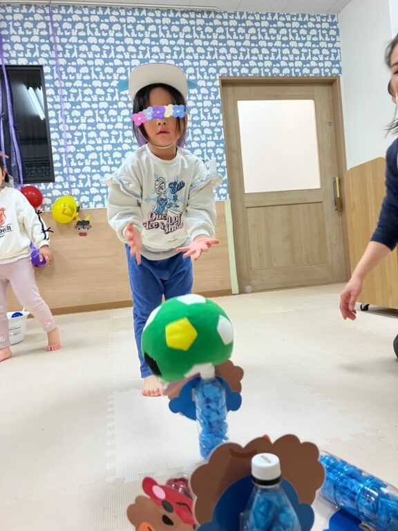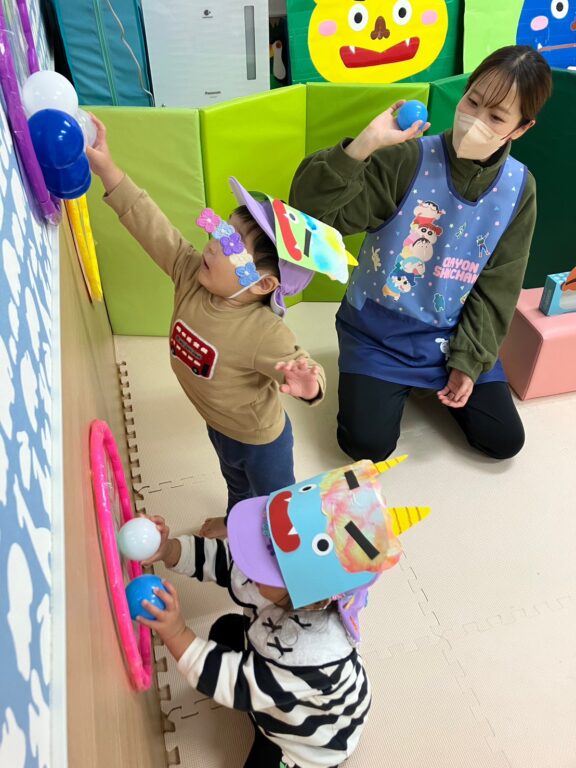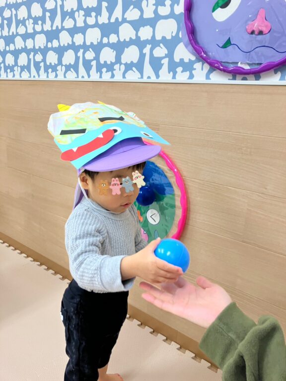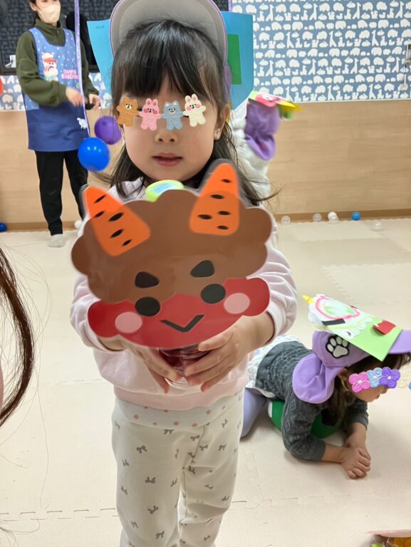 子ども達1人1人が楽しみながら作った鬼さんのお面を付け、「鬼さんをやっつける❗️」べく、「鬼さん的当て、鬼さんボーリング」などのゲームを楽しみました❣️最後には鬼さんのパネルに向かって皆んなで「おにはーそと❗️❗️」お面をつけてお散歩にも出かけました😆