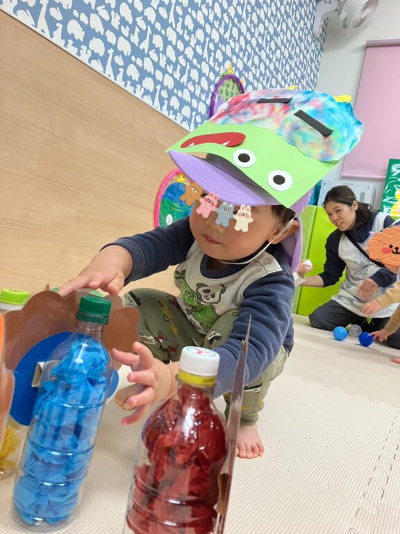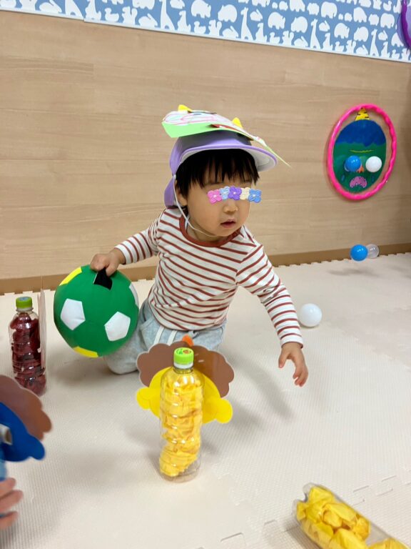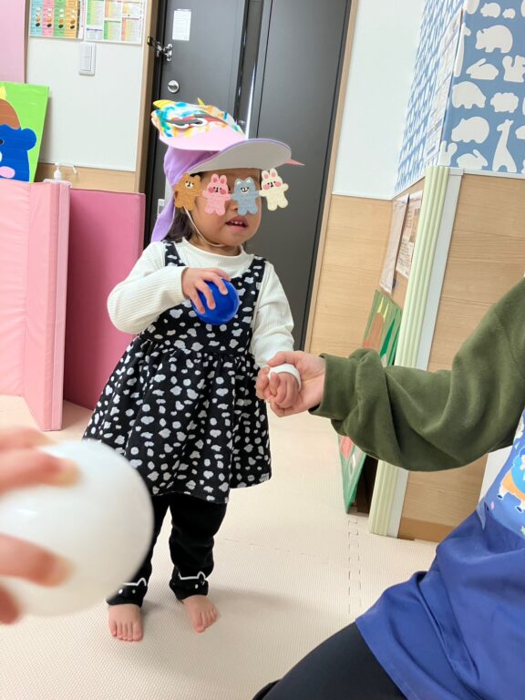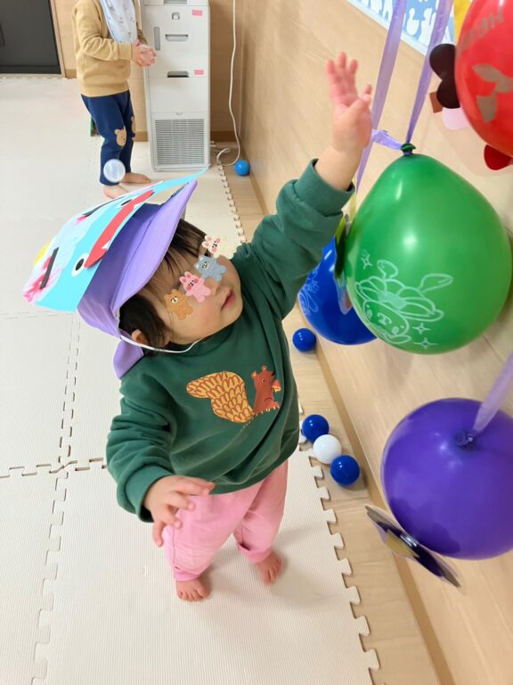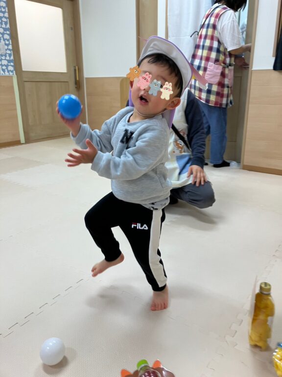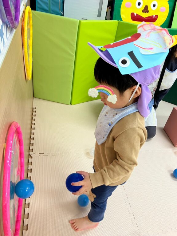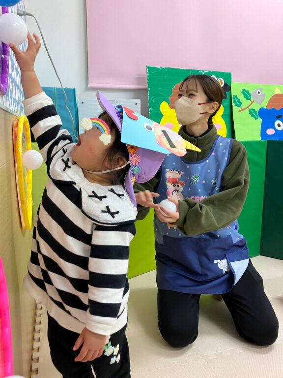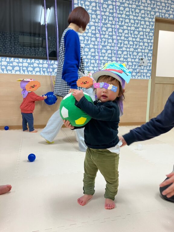 子ども達1人1人が楽しみながら作った鬼さんのお面を付け、「鬼さんをやっつける❗️」べく、「鬼さん的当て、鬼さんボーリング」などのゲームを楽しみました❣️最後には鬼さんのパネルに向かって皆んなで「おにはーそと❗️❗️」お面をつけてお散歩にも出かけました😆