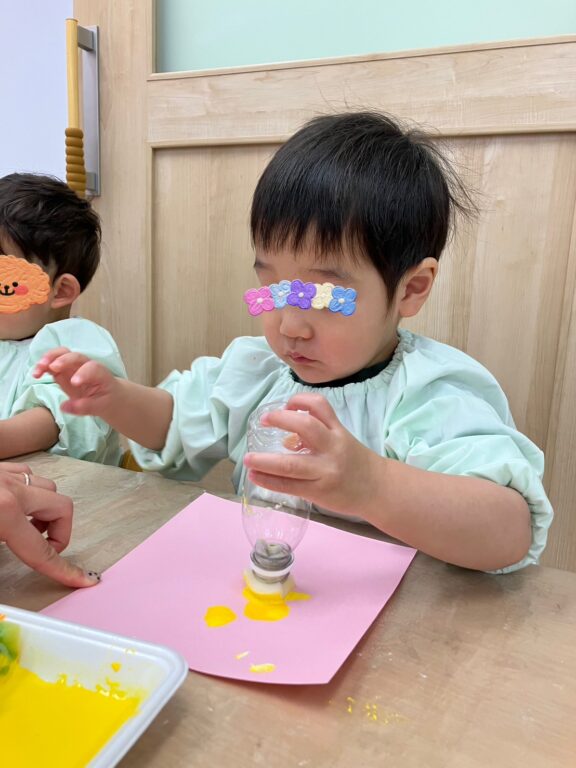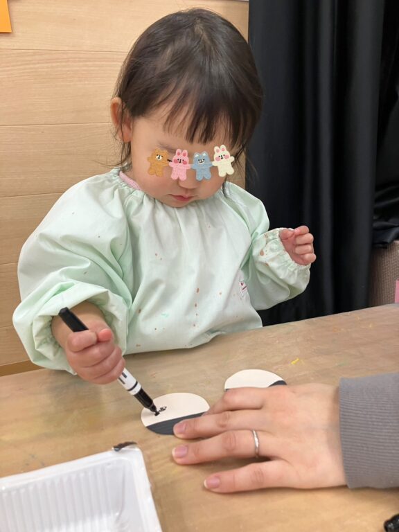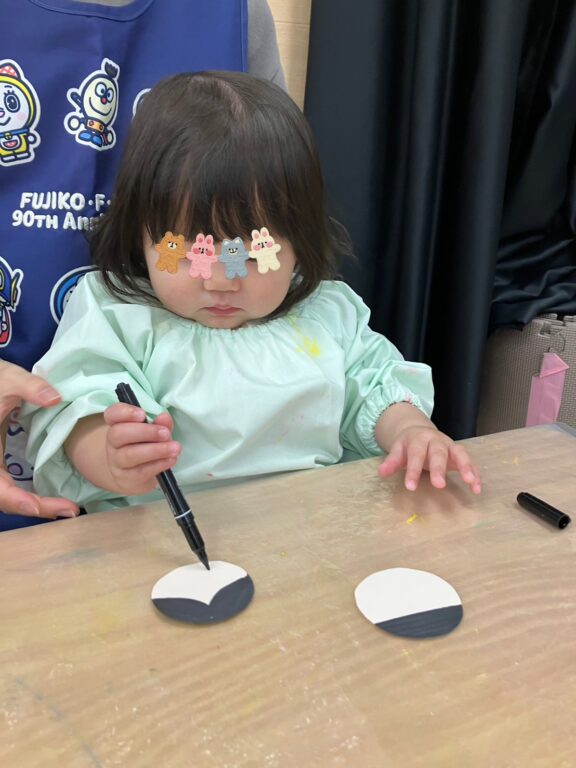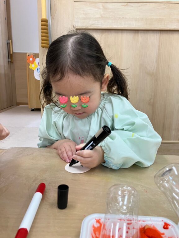 製作当日は、屏風の模様を絵の具でスタンピングとんとん❗️おひなさまとおだいりさまの体には、子ども達が自分で選んだお花紙を丸めてギュッギュッ🎀もちろんおひなさまとおだいりさまの顔はペンで自分で描き入れ、仕上げの尺や扇もペタンと上手に貼り付けられました🌈