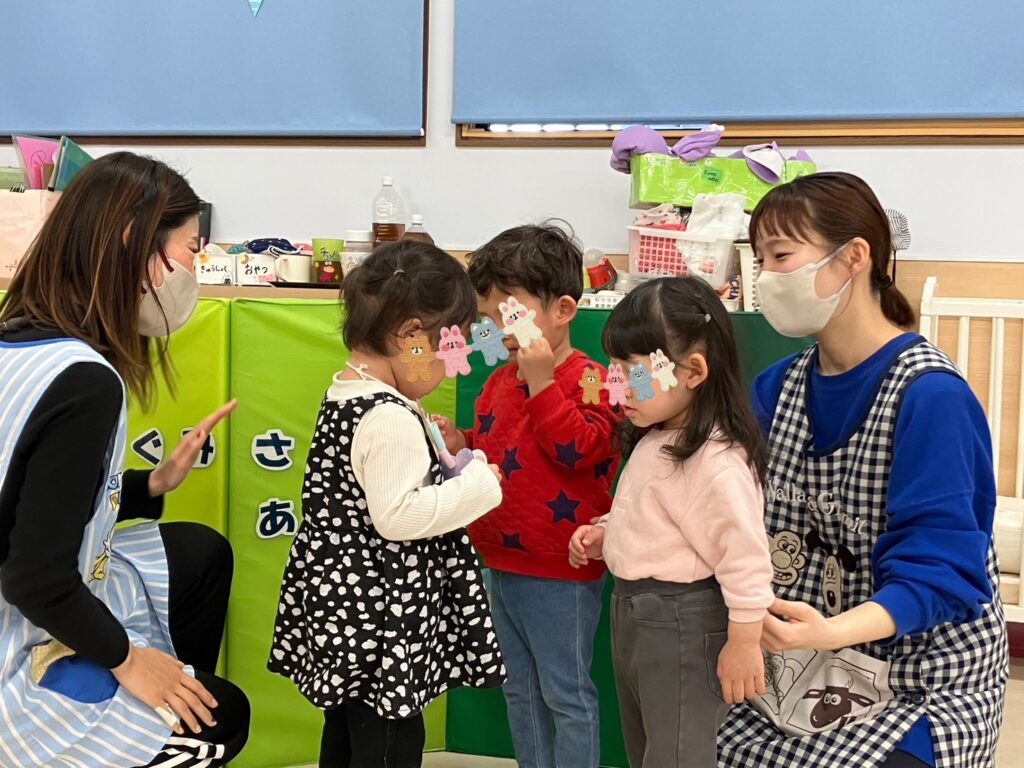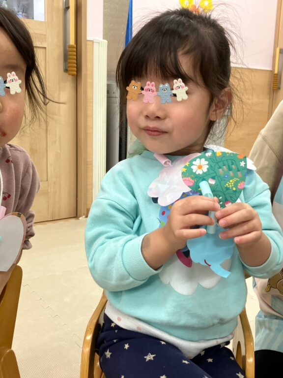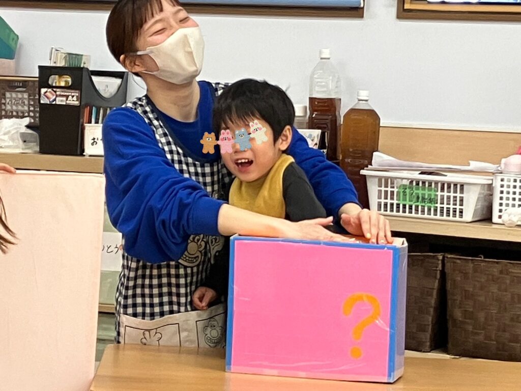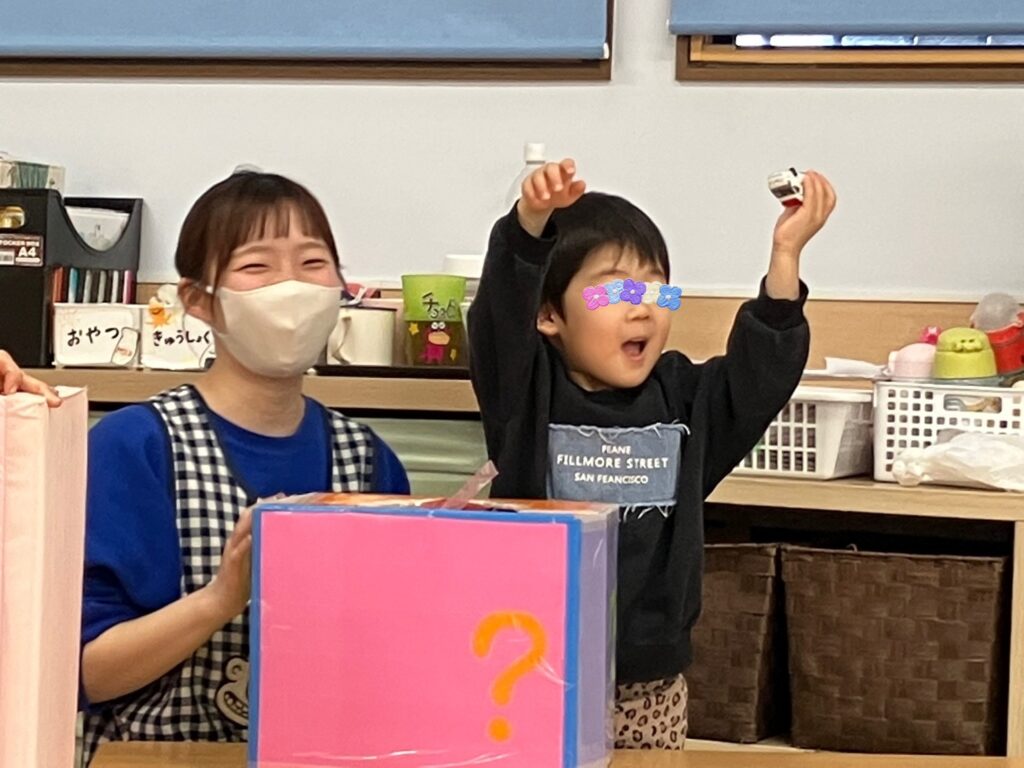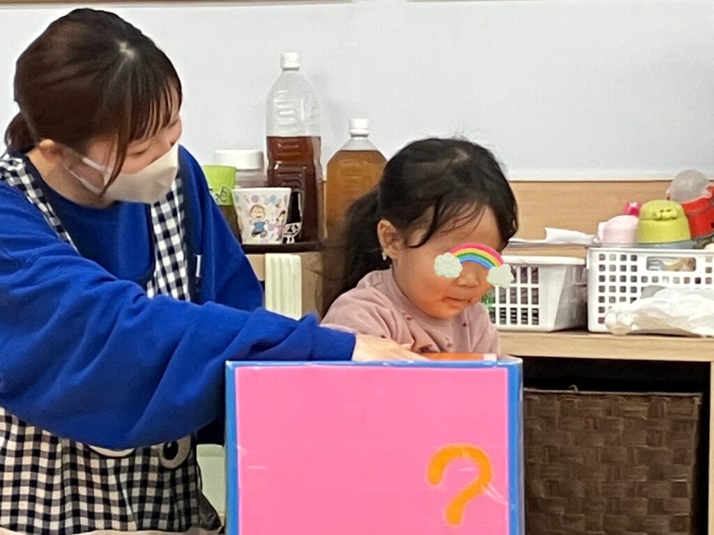 「箱の中はなんでしょう❓」ゲームでは、先生達が用意したおもちゃなどを箱に入れ、そっと手を入れ探ります🌟「これなぁに❓」「えーっとー💦コップ😆」「ブロックかなー😚」「バイキンマンのおにんぎょう❗️」どんどん正解して行くぞうぐみさん🥰それを見ていたパンダぐみさん達もうずうず😍「やりたーい‼️」楽しいゲームタイムでした🌈