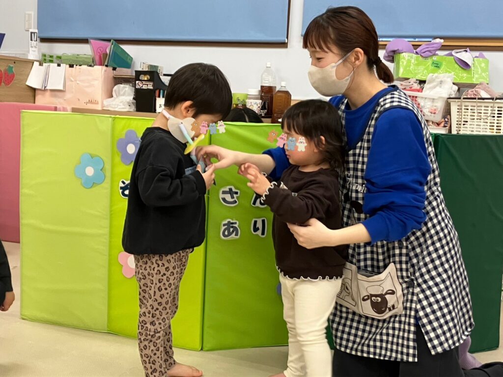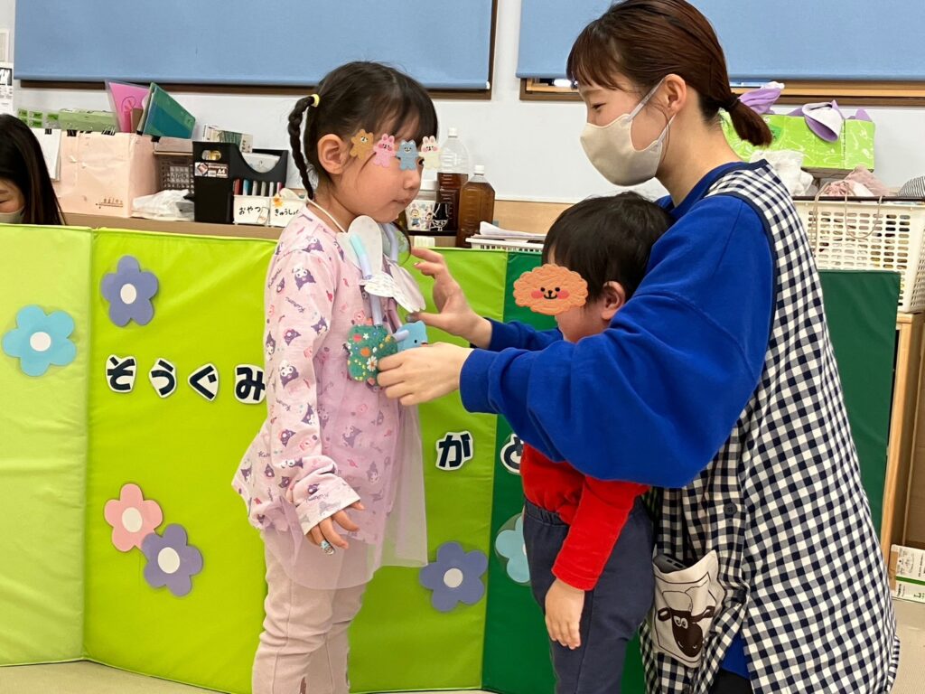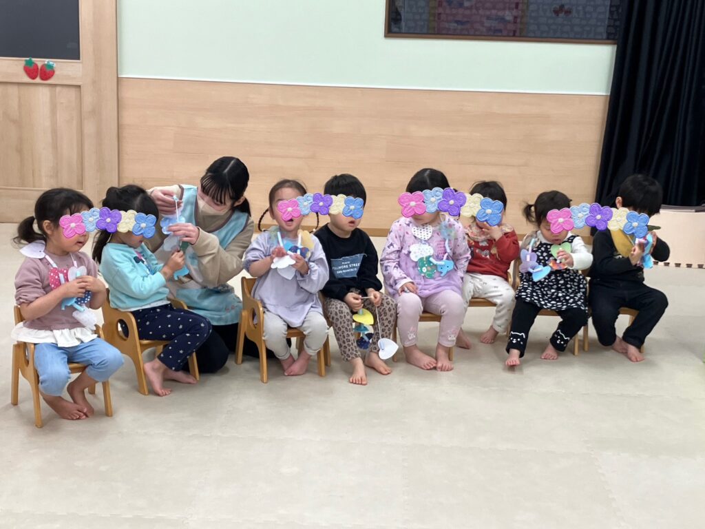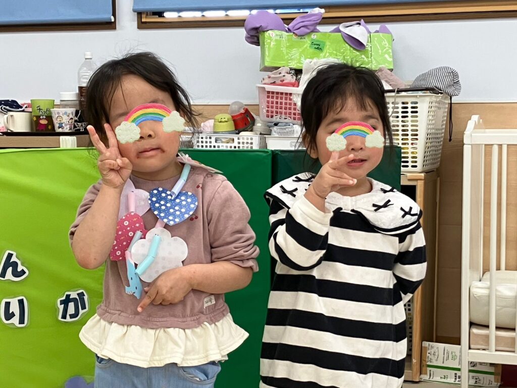 「箱の中はなんでしょう❓」ゲームでは、先生達が用意したおもちゃなどを箱に入れ、そっと手を入れ探ります🌟「これなぁに❓」「えーっとー💦コップ😆」「ブロックかなー😚」「バイキンマンのおにんぎょう❗️」どんどん正解して行くぞうぐみさん🥰それを見ていたパンダぐみさん達もうずうず😍「やりたーい‼️」楽しいゲームタイムでした🌈