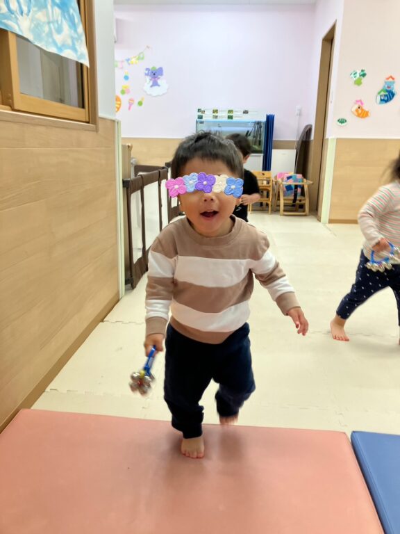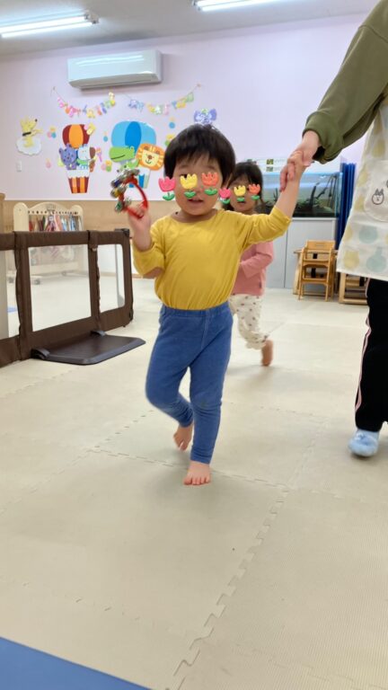 リトミックの時間には、自分の作った鯉のぼりバッグを眺めながら、歩いたり走ったり、ジャンプしたり😆