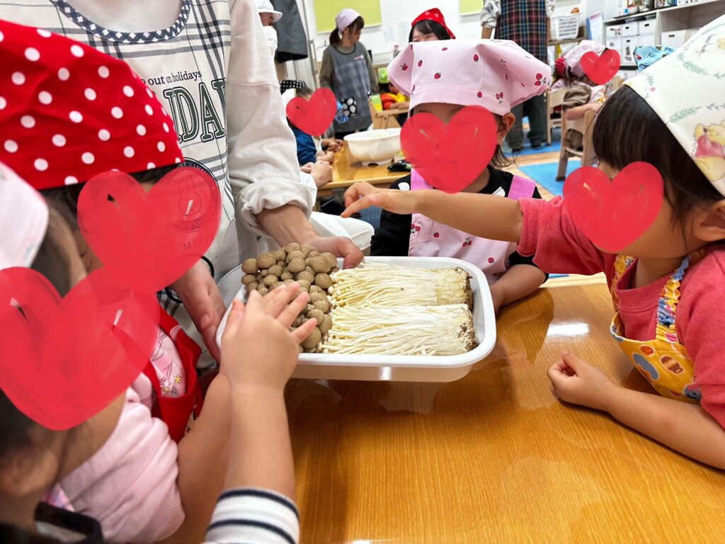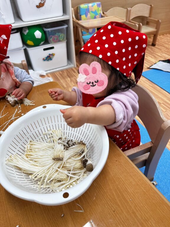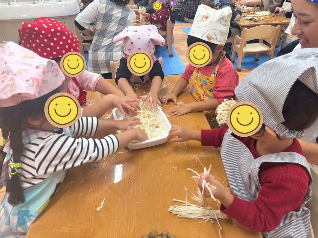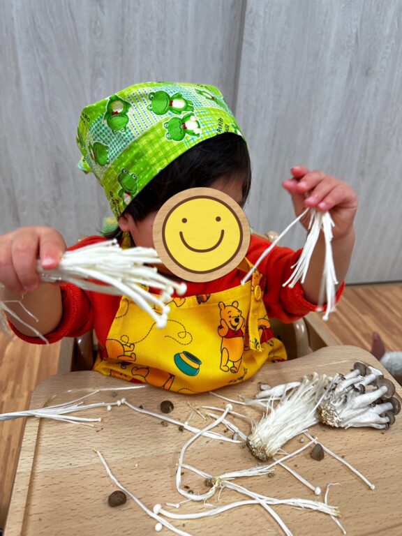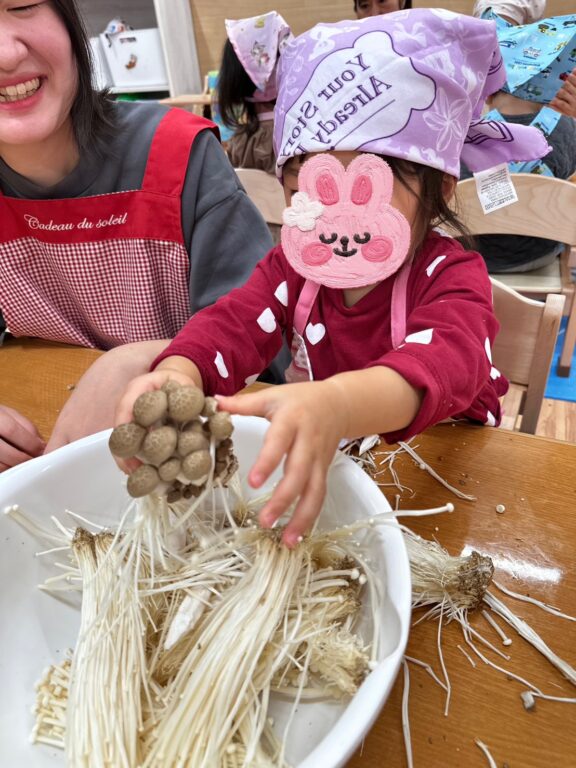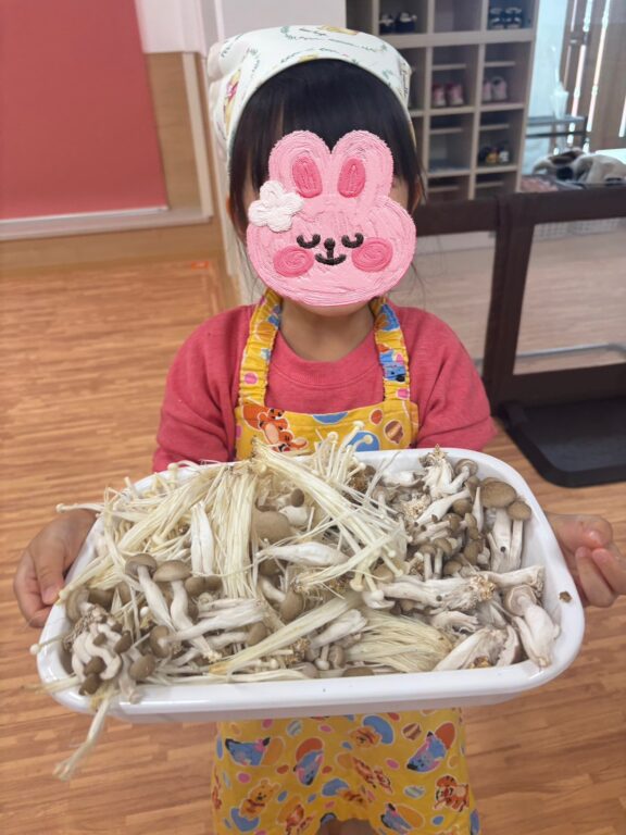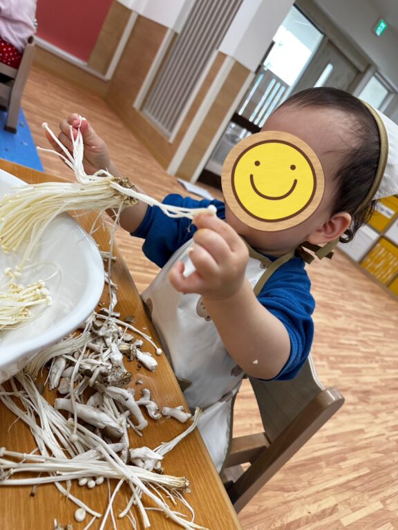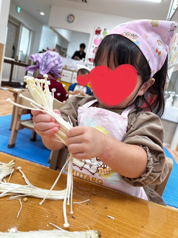 今月の食育活動では、本物のえのきとしめじを使って「きのこさき」を行いました✨
