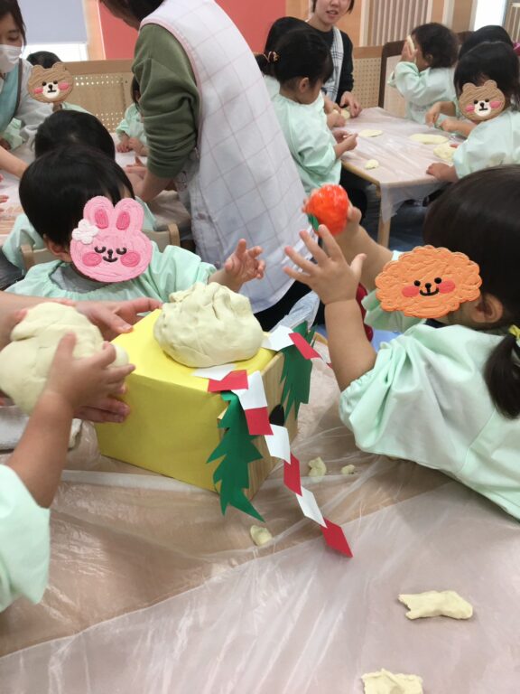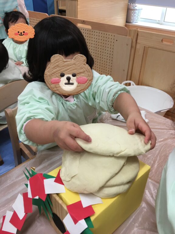 小麦粉粘土で鏡餅作りにも挑戦しました🫡やわらかくてちょっぴり冷たい感触に興味津々の子どもたち😊ぎゅっと握って指の跡がつくと、じっと見つめたり、丸めてはつぶしてを繰り返したりと、それぞれの楽しみ方で遊んでいました❤️保育士と一緒に丸を重ねて鏡餅の形になると、「できた🙌」とクラス別に個性的な鏡餅ができました⭐️