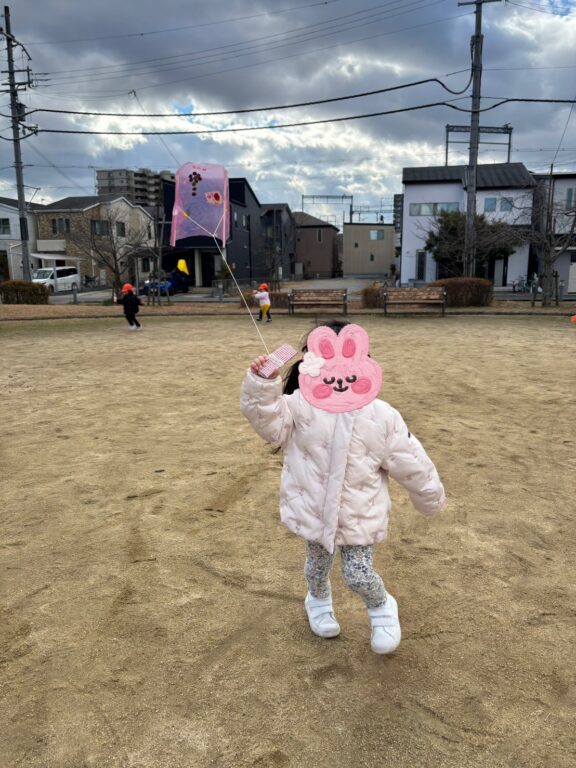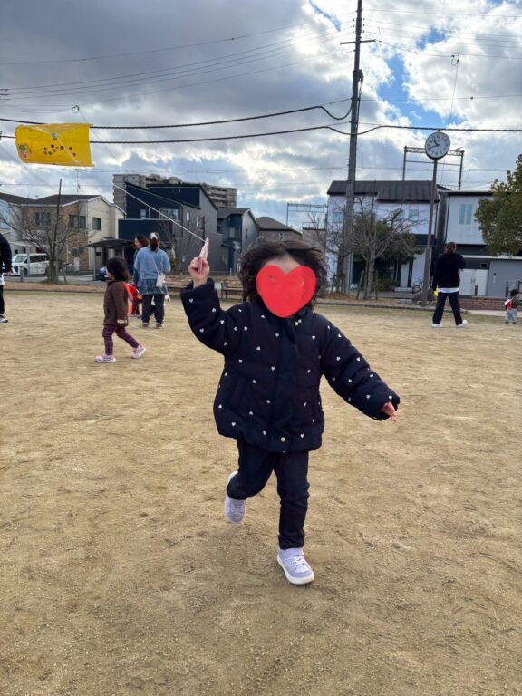 自分で作った凧を持って公園へ🙌凧を持って一緒に走り、「まってー💦」と追いかけたり、風に揺れる凧に大喜び😆寒さも忘れて公園中走り回りました❣️