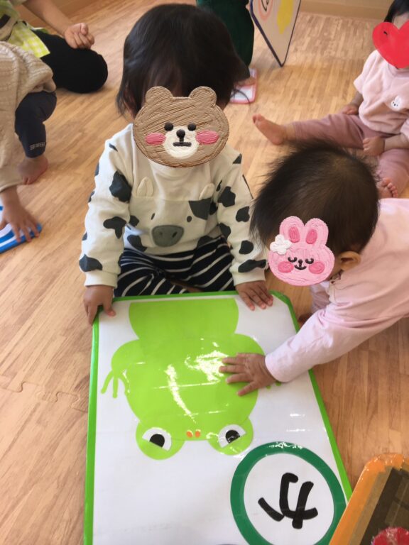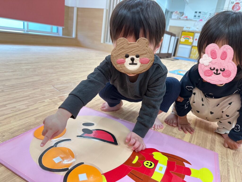 室内では、ジャンボ福笑いとジャンボかるたに挑戦☝️目や口が少しずれたアンパンマン達にみんなで大笑い😂大きなおせちも作れましたよ🤭かるたでは、絵を見つけるとダッシュ‼️白熱したかるた大会に大盛上がりでした🙌