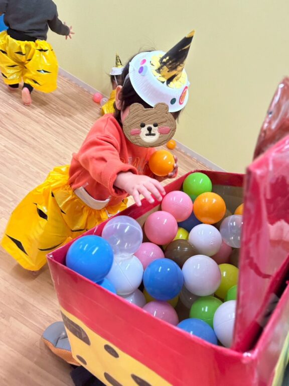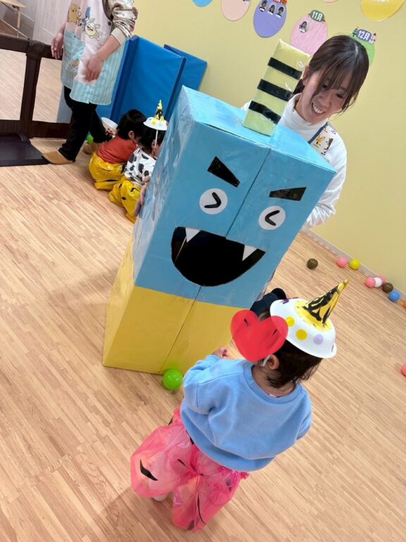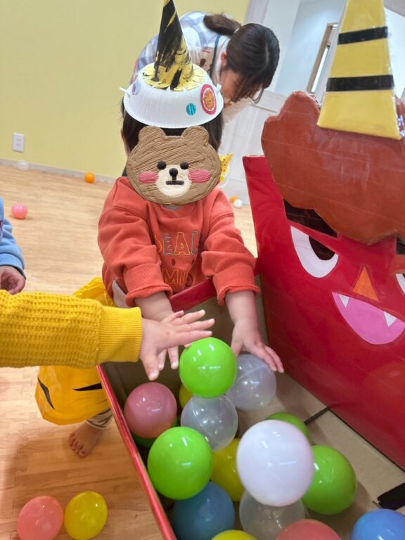 小さいお友だちも鬼さんの近くまでそーっと歩いていき、優しくボールを転がしたり「どうぞ❤️」手渡したりと、とっても可愛い鬼退治を楽しんでいました🤭