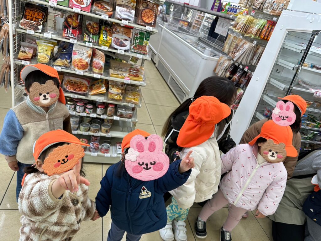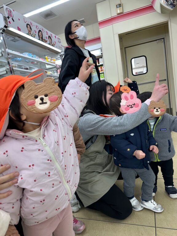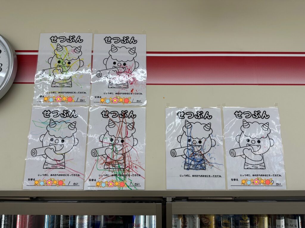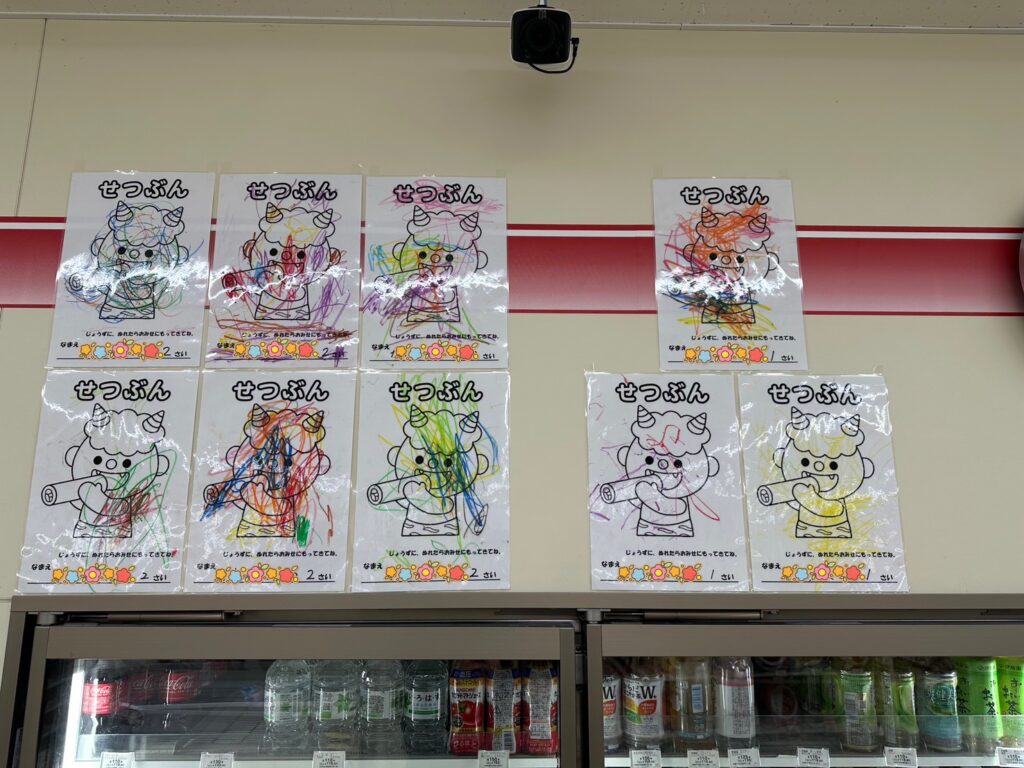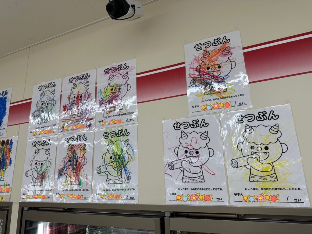 近くのコンビニに、子どもたちが節分で描いた鬼の塗り絵を飾っていただきました👹✨