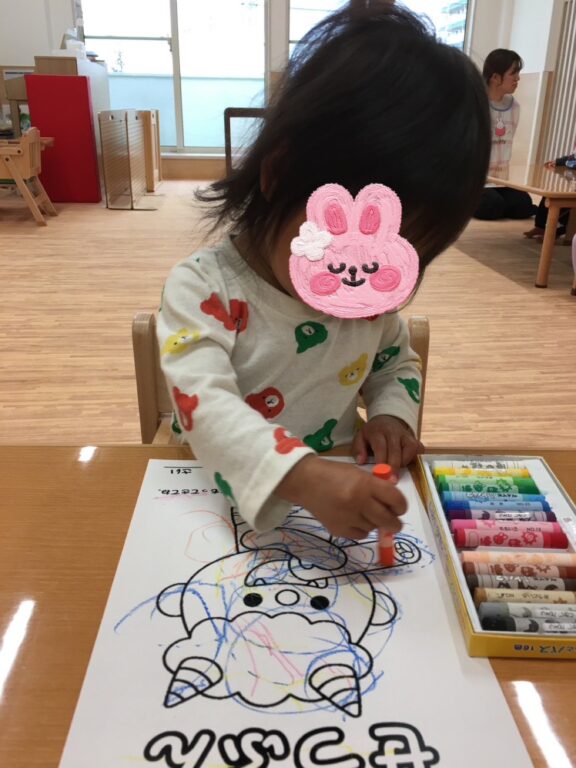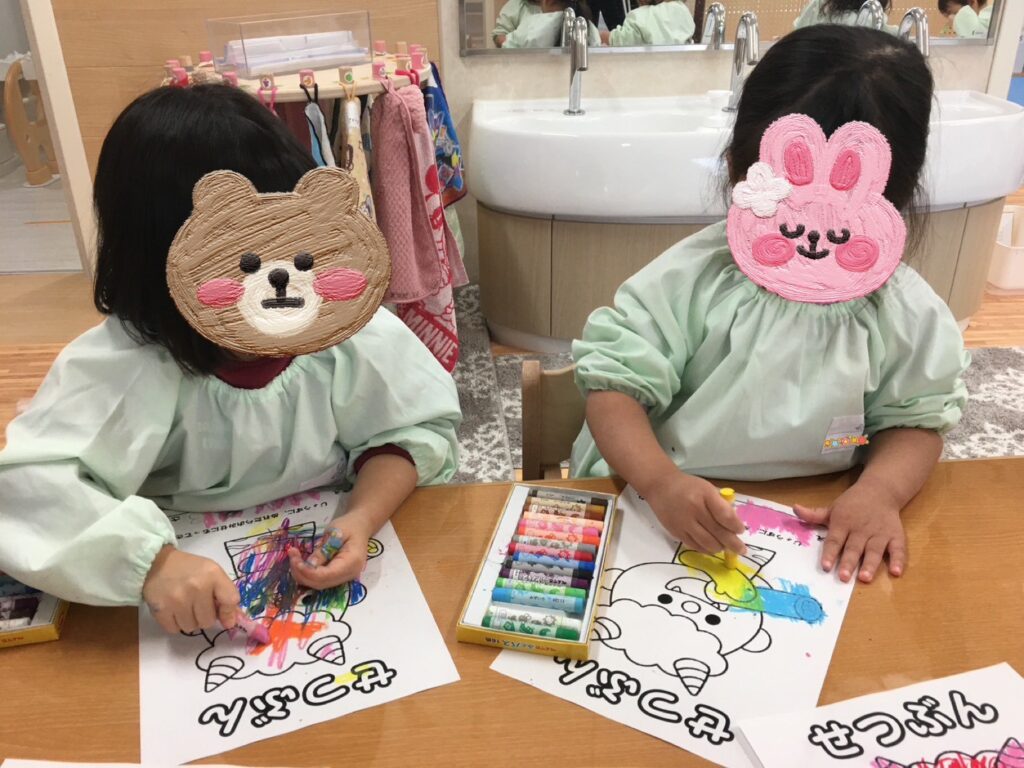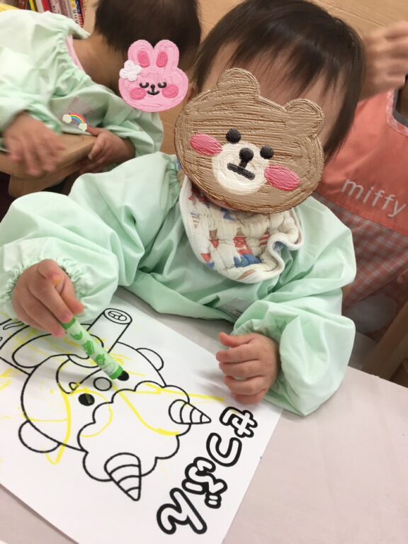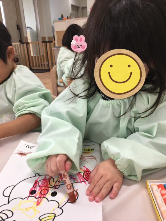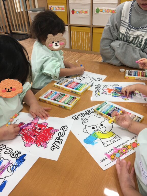 「この色にする❣️」「あかがいい🩷」と、それぞれ好きな色を選び、クレヨンを握って一生懸命塗り込む子どもたち😊個性あふれるとっても可愛い鬼さんたちが完成しました😆