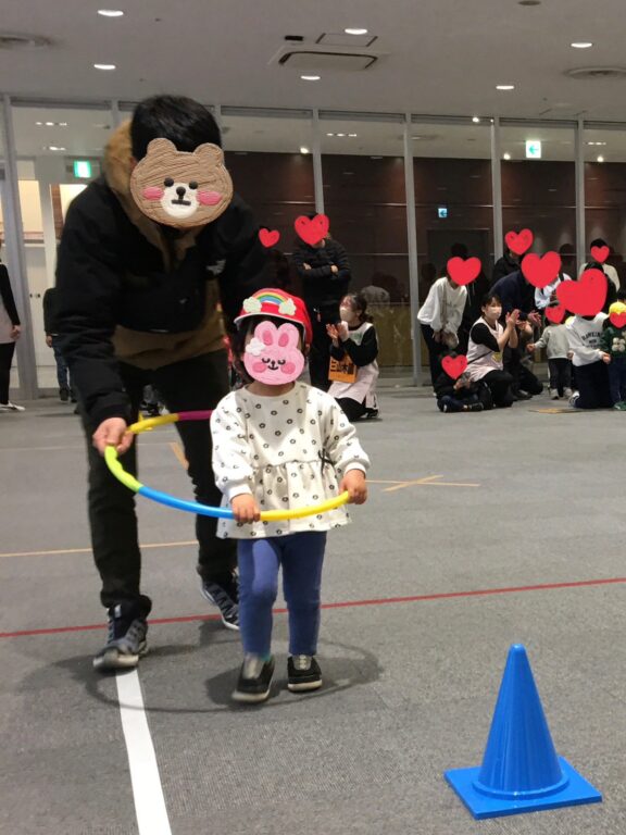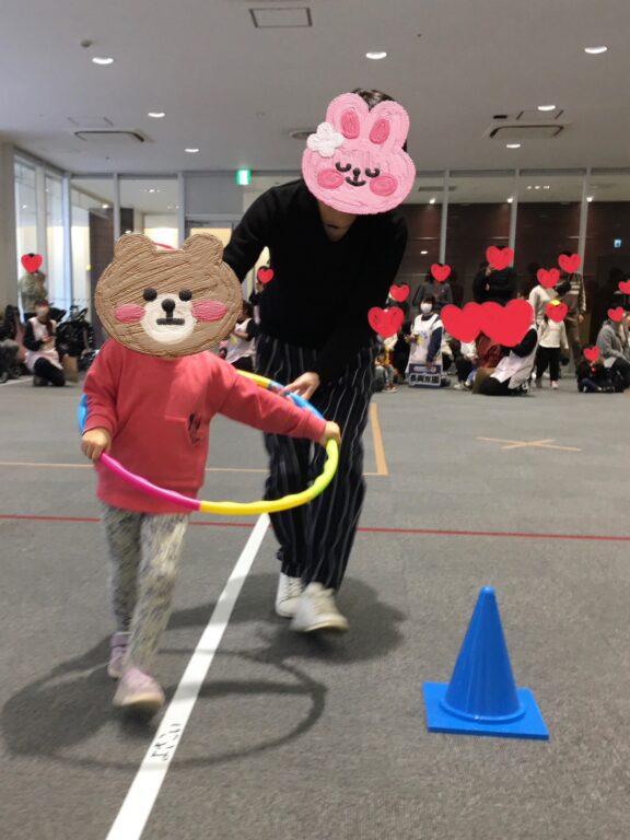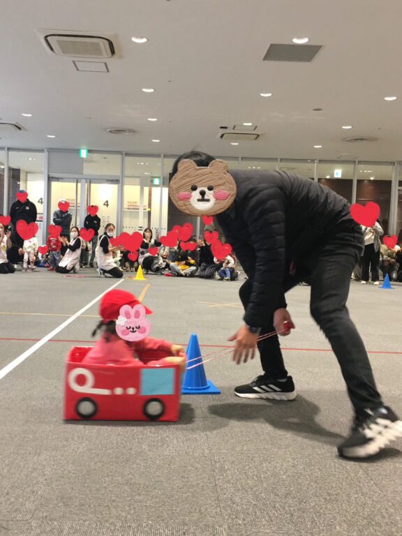 親子フラフープ競争や車引き競争では、子どもたちにかっこいい姿を見せようと、保護者の皆さんも大張り切り💪