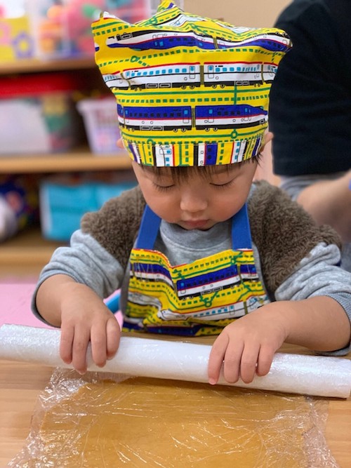 手を洗って座ると給食の先生が作り方のお話をしてくれました。まずは クッキーの生地を伸ばします❗️