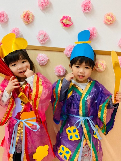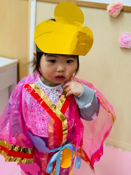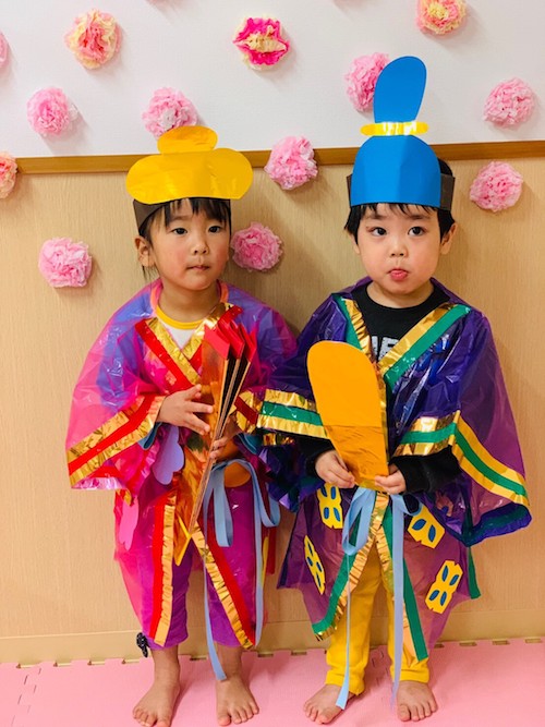 衣装を着て、冠を付けて、扇子と尺を手に持ち、とっても可愛いお雛様とお内裏さまが出来上がりました🎎❤️お写真を撮るときにポーズをしたり、照れたり、お友だちをみて「かわいーー💕」ととてもみんなノリノリでしたよ☺️
