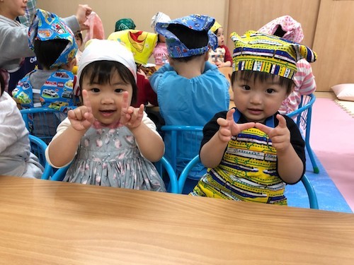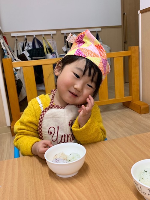 小さい頃から食材に触れ器具に触れ、自分たちで作った物を食べる。子ども達の素敵な時間になったと感じています。作っている時も食べている時も、たくさんの笑顔があり、かわいいコックさん達の頑張りがあり、私達も楽しい時間を過ごす事が出来ました❤️