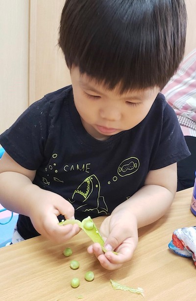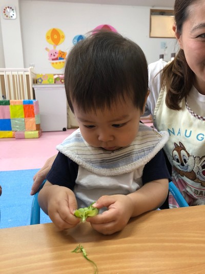 保育士と一緒にスジを取って、ぱかっと開くと出てきたお豆🎵小さな手で一つひとつ取り出し上手にカゴへ入れ、一つ終わるとまた次…と黙々と楽しんでいました😊✨