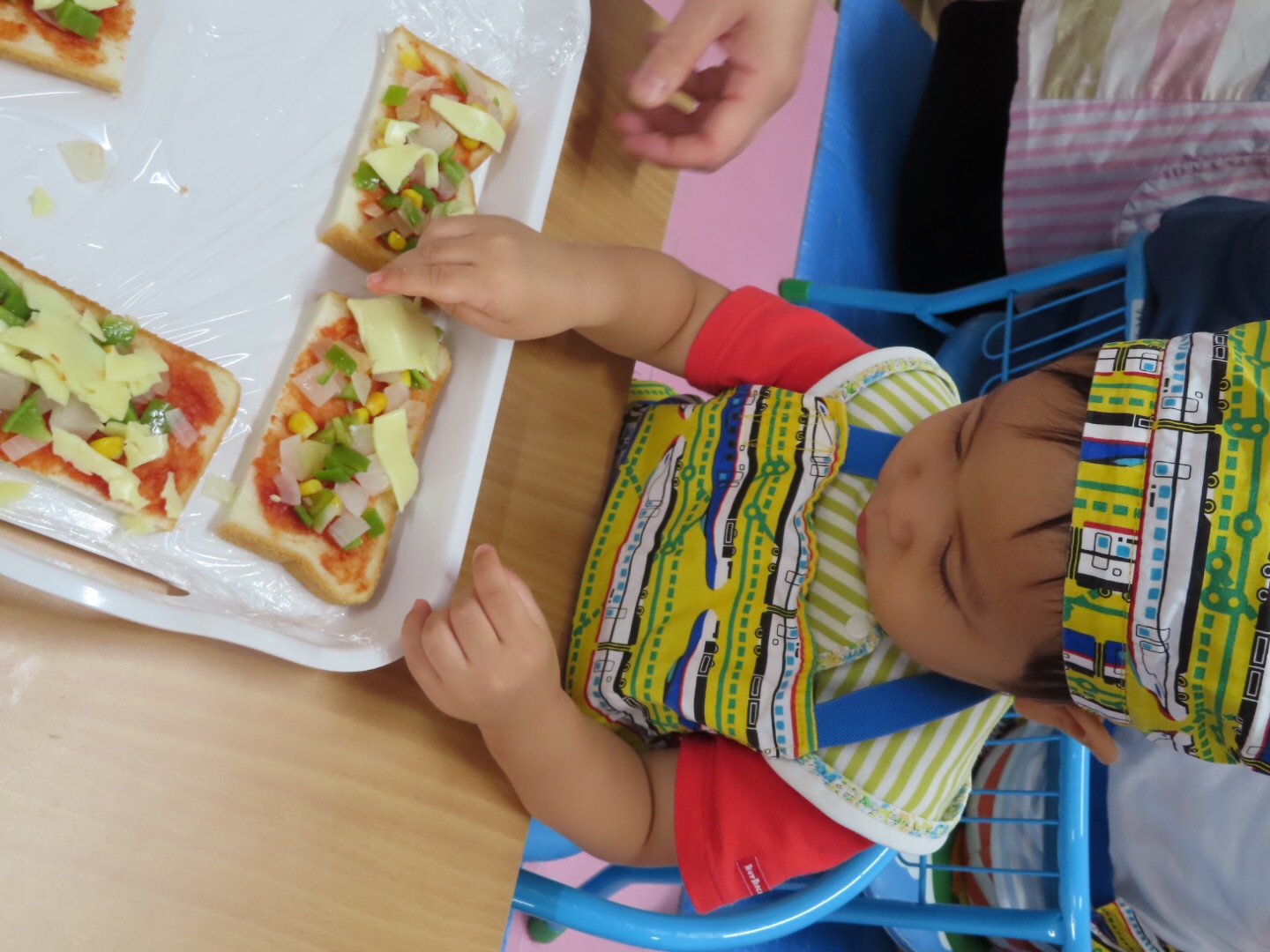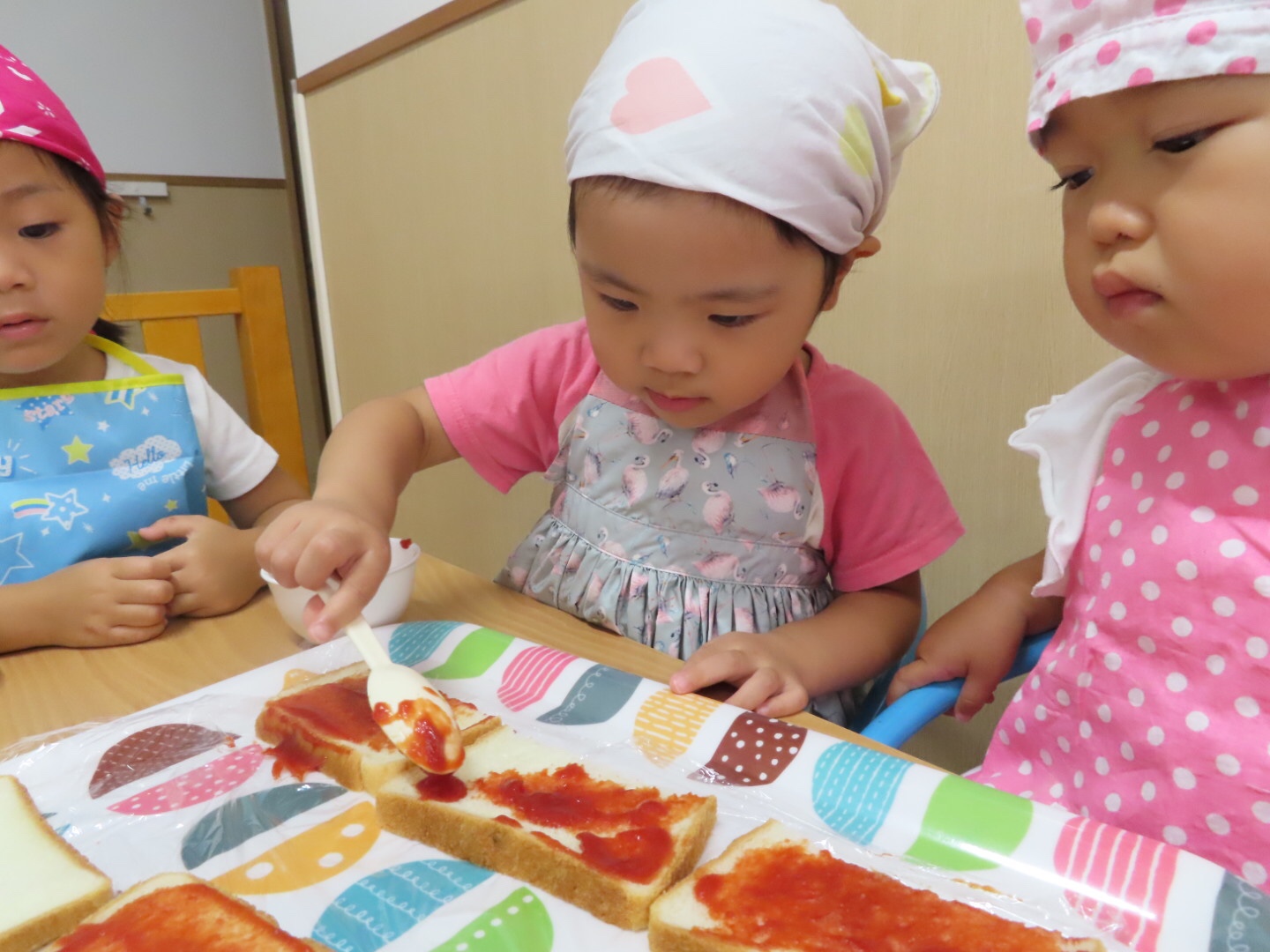 そして、みかんぐみとももぐみの子どもたは“ピザトースト”🍕づくり😁