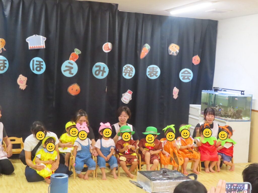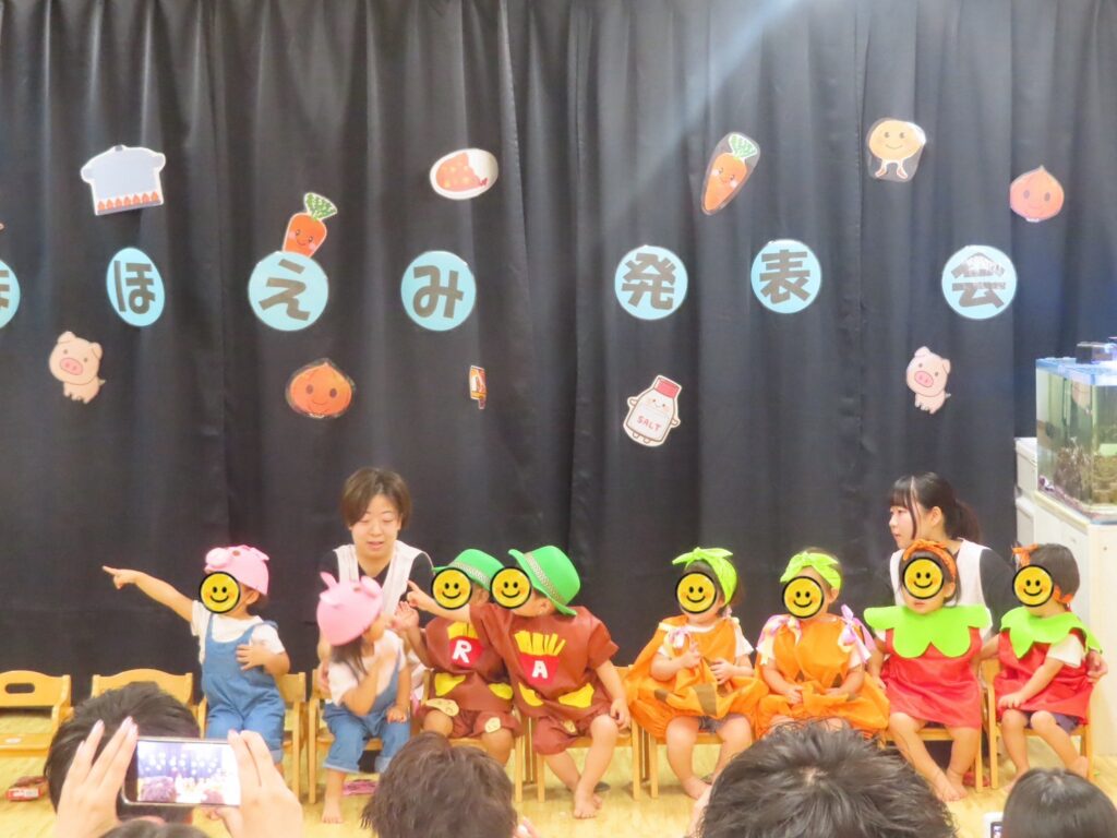 みかん組さんは、『カレーライスを作ろう🍛』をテーマにカレーの具材になって登場🥕 皆んな揃ったら、お返事をしたり、大好きな手遊びをしたり普段の様子を見てもらいました👀 そしてカレーライスの歌を歌ってカレーライスを作りましたよ🍴 いつも歌っている給食の歌や、いただきます・ごちそうさまの様子を見てもらえたかなと思います😋