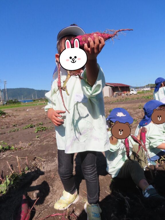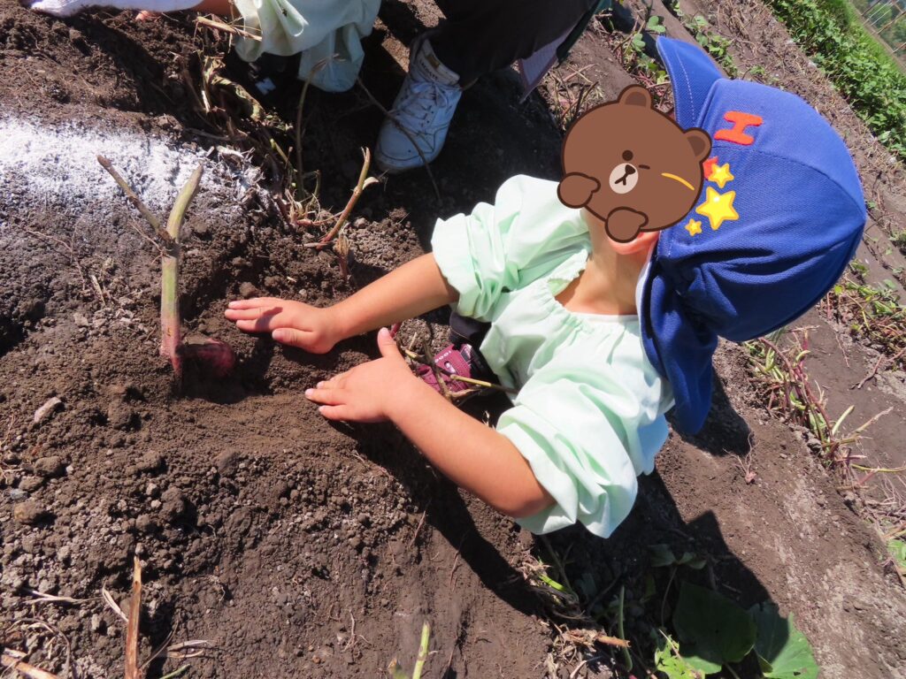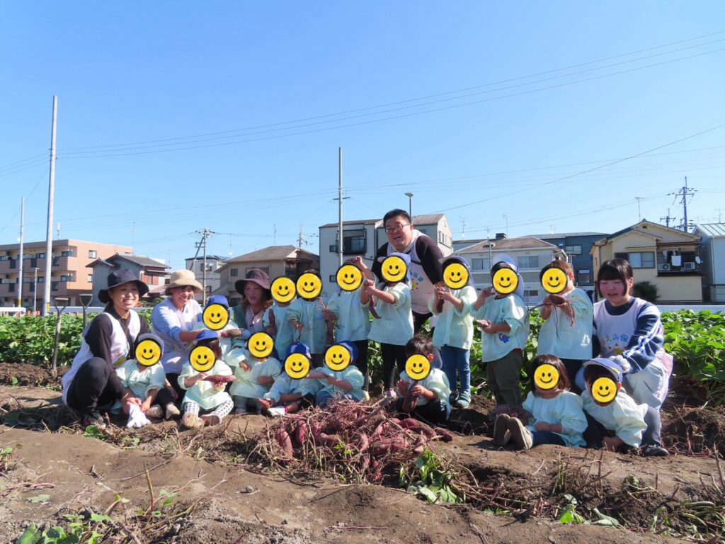 お芋の畑まで歩いて行き、お芋掘りスタート✨ 土を触って、どんどん掘っていく子どもたち👦🧒 虫さんを見つけてびっくりしたり🫢 喜んだり🐛 もっと掘っていくと、お芋の顔が見えてきます🍠 『おいもー!』と嬉しそうな子どもたち😍 お芋が掘れていくと、自分のお芋を持って歩いて他の先生に見せに行っていました⭐️ 毎年に比べると少し不作でしたが、子どもたちは土に触れて、虫を見つけて貴重な体験が出来ました✨ 掘れたお芋と皆んなで写真を撮って、次は長岡公園へ向かいます🚌