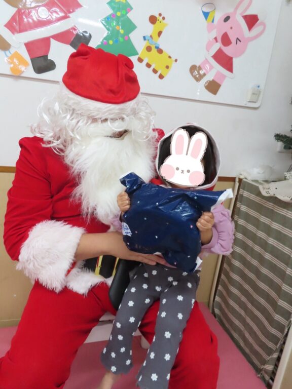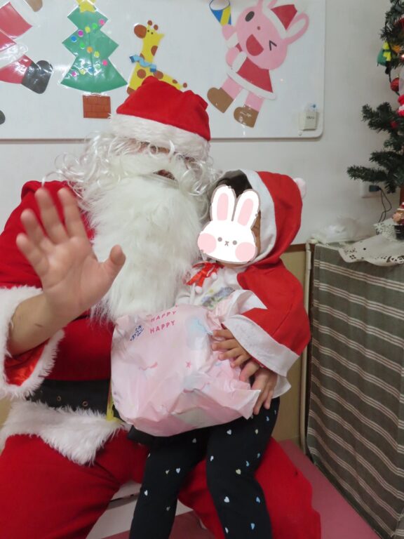 大きなサンタさんにびっくりしている子もいましたが、サンタさんとトナカイさんと一緒に『あわてんぼうのサンタクロース』を歌い仲良くなりました🩷 その後は、みんなが待っていたプレゼント🎁 1人ずつサンタさんに抱っこしてもらいプレゼントをもらって、一緒に写真を撮りました📷 ドキドキしながらも、『ありがとう❗️』とお礼を言っている子もいましたよ☺️