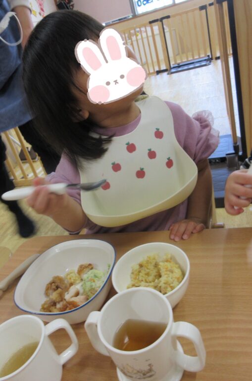 唐揚げ🍗・カレーピラフ・ツリーサラダ・スーパーです😆 お星様の人参の飾りに『キラキラ〜』と嬉しそうな子どもたち🩷 いただきますをすると、皆んなたーーーくさん食べてくれました😋