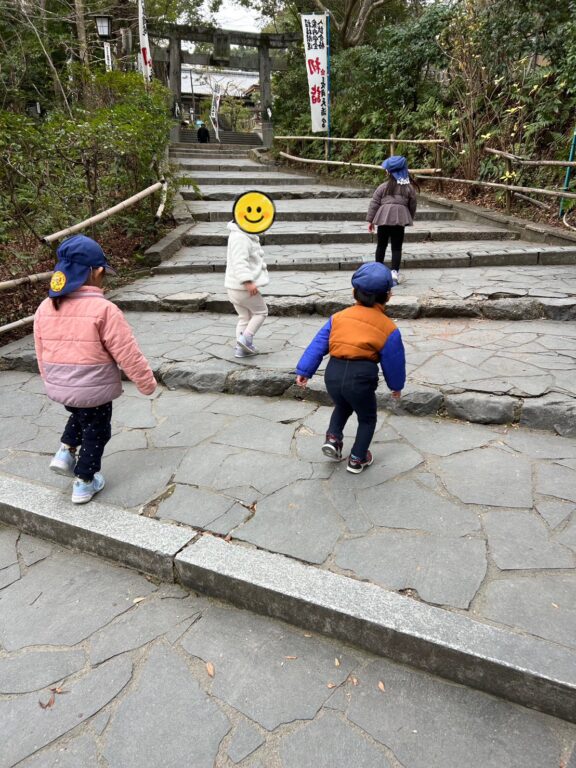 もも組さんは、どんどんと登っていきます! しっかり体力も付いたなと成長を感じました🩷 皆んなで境内まで登り、牛さんの前で記念写真🐮