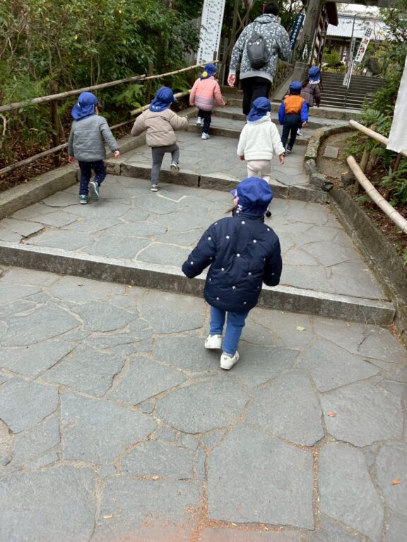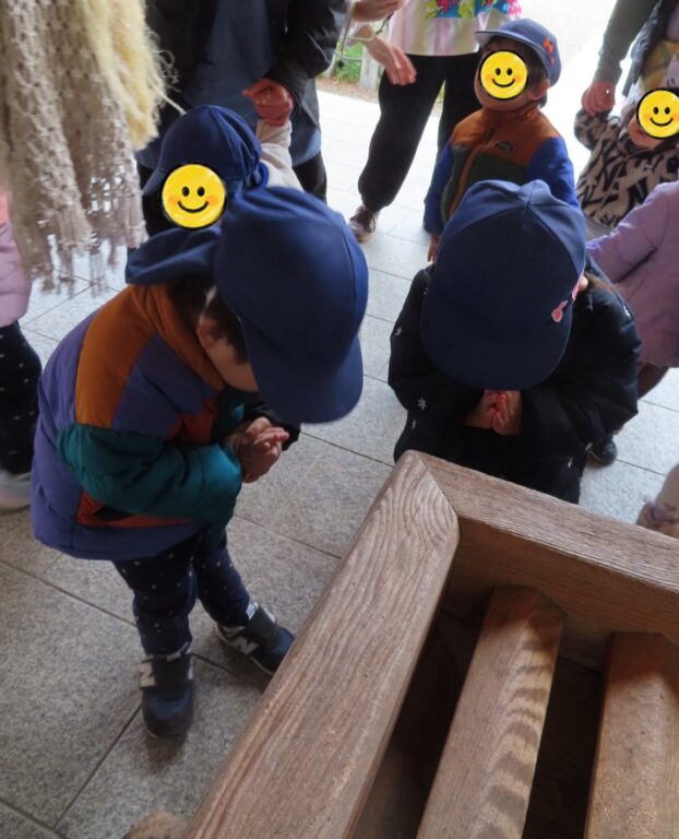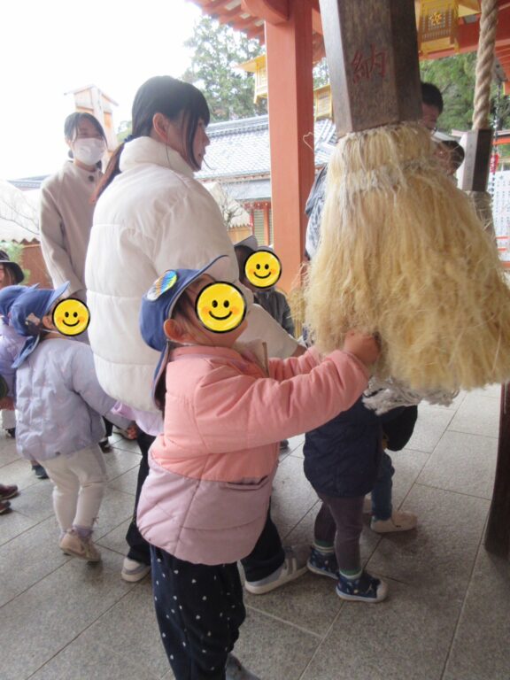 そして、順番にお参りに⛩️ 大きな鈴が気になって見上げる子どもたち、太い縄を握って揺らす子もいましたよ😆