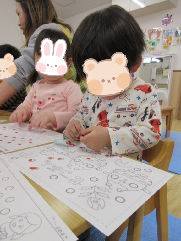 ぬりえとシール貼りもしましたよ😛 鬼や豆の描いてあるぬりえの中から自分で好きな物を選んで塗りました🌟 『あおの鬼さんにする!』『鬼さんぬりぬりできたよ!』とお話ししながら沢山塗ってくれました✨ シール貼りでは、⭕️の書いてある所にシールを貼っていきます。『きいろにするー』『あおがいいー』と色をリクエストしてシールをもらいます。好きな所にどんどん貼る子、丁寧に丁寧に⭕️の中にシールが収まるように貼っている子、どちらも一生懸命に貼りました☺️