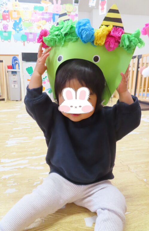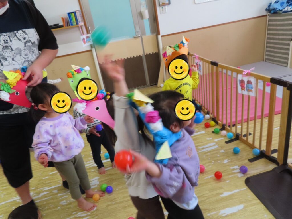 そして、自分たちで作った鬼のお面を被って、豆まきスタート✨ カラーボールを持って、鬼の絵に向かって投げて、鬼をやっつけます‼️ 『えーい!』『当たったー!』とたくさん投げていました⭐️ 2歳児さんになると、ボールの威力も強く、速ーーい球を投げている子もいました⚾️ 0歳児さんは、先生に抱っこしてもらって、鬼にボールを投げましたよ☺️