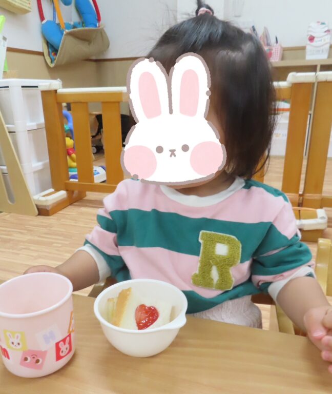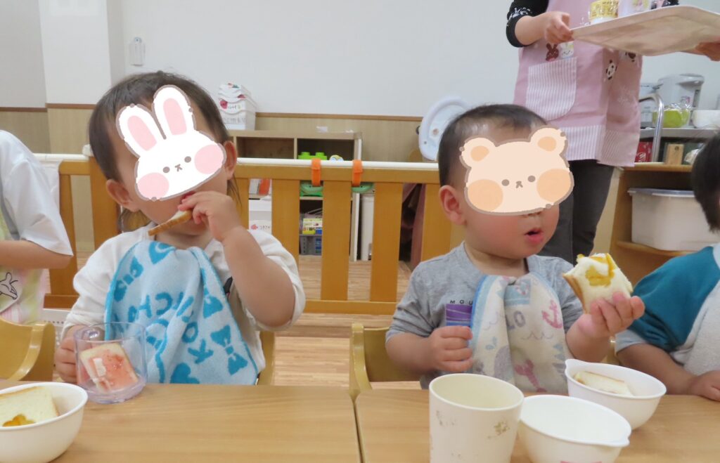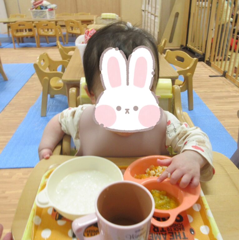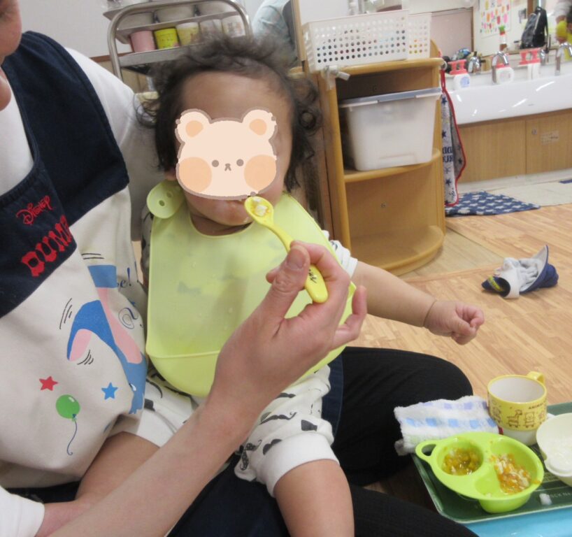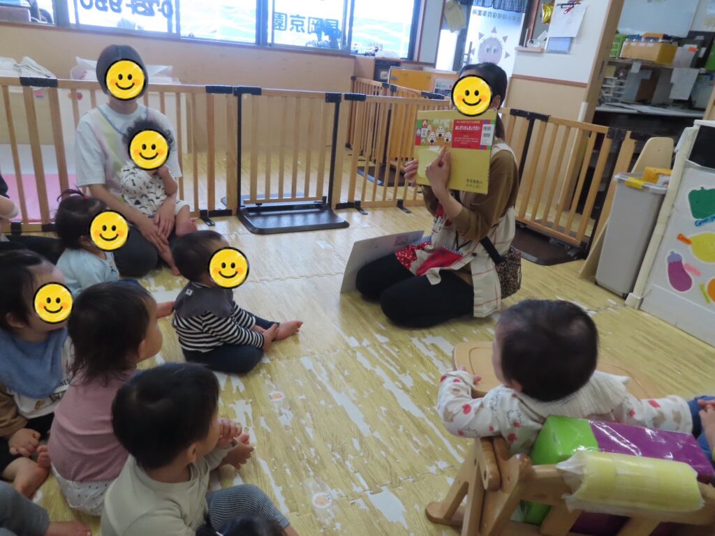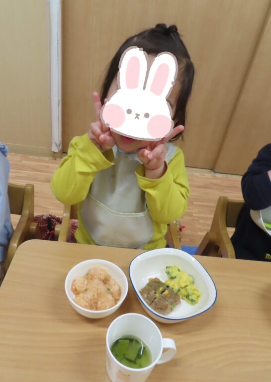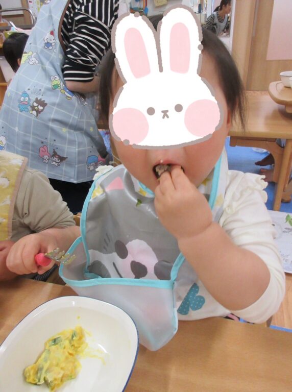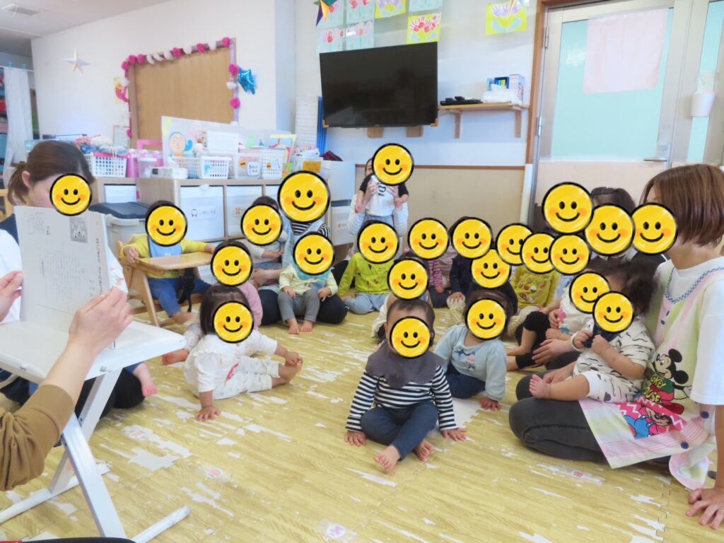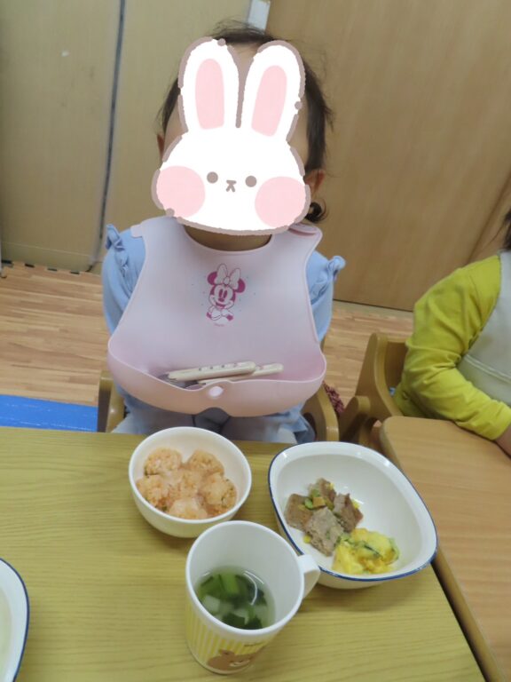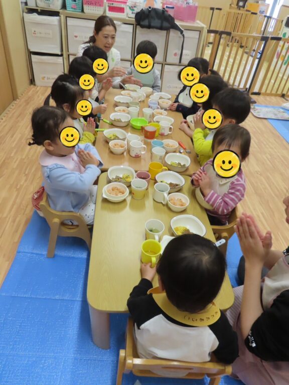 保育園で皆んなで色んなご飯を食べるお話をしたり、今日の給食は何だったかな?などを聞きいたりしました😃
