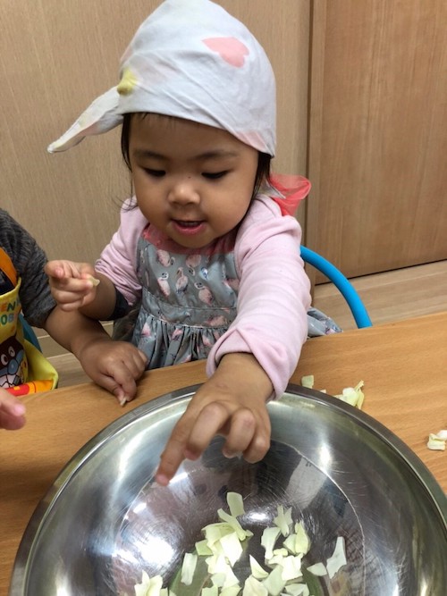 最後にみんなでちぎったキャベツも入れて混ぜます💗