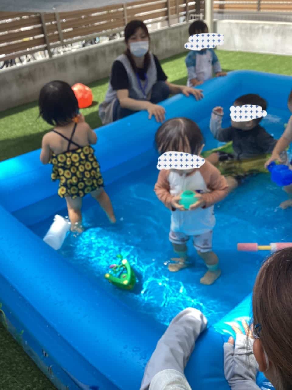 大小のプールで、水しぶきをあげてダイナミックに遊ぶ子どもや、浸かってのんびりと玩具で遊ぶ子ども、入水は少し怖いのでプールサイドの芝生で遊ぶ子どもなど様々です❤️